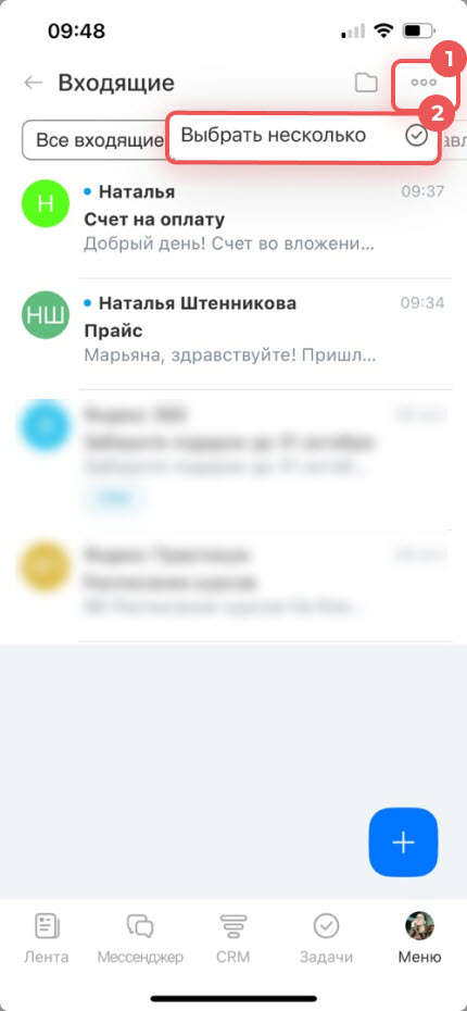 1–2. Нажмите Три точки (...) > Выбрать несколько. Кликните на нужные письма.