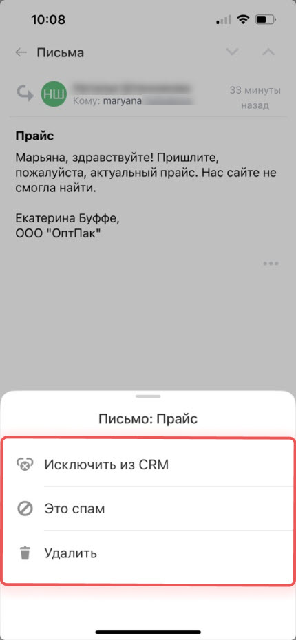 Чтобы исключить письмо из CRM, пометить как спам или удалить — нажмите Меню (...).