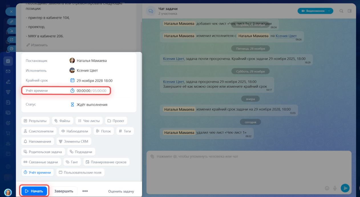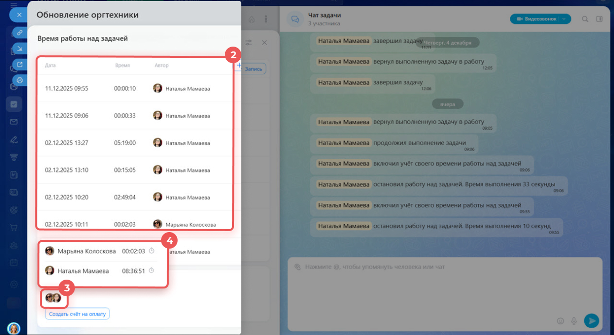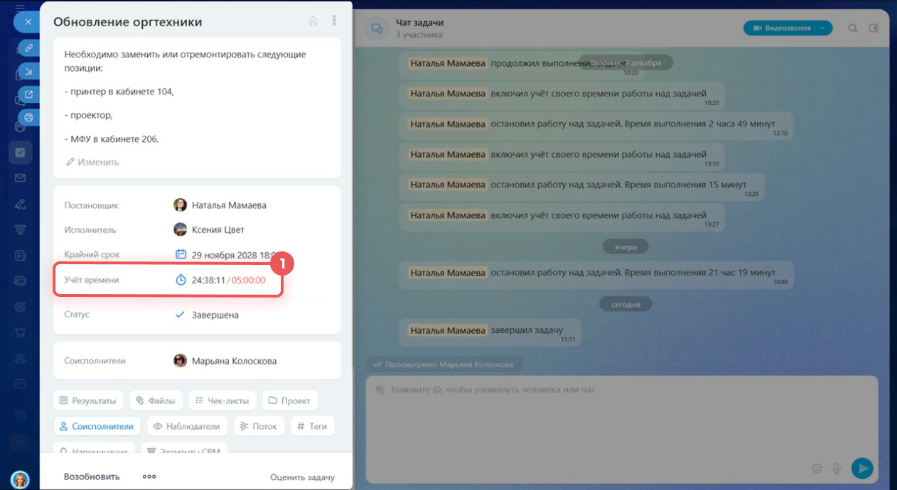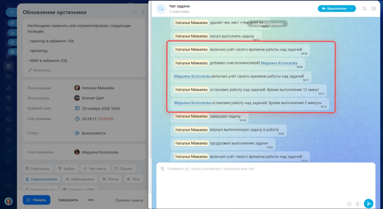 История учета времени показывает, кто, когда и как долго работал над задачей. Посмотреть записи можно в чате задачи или ее карточке.