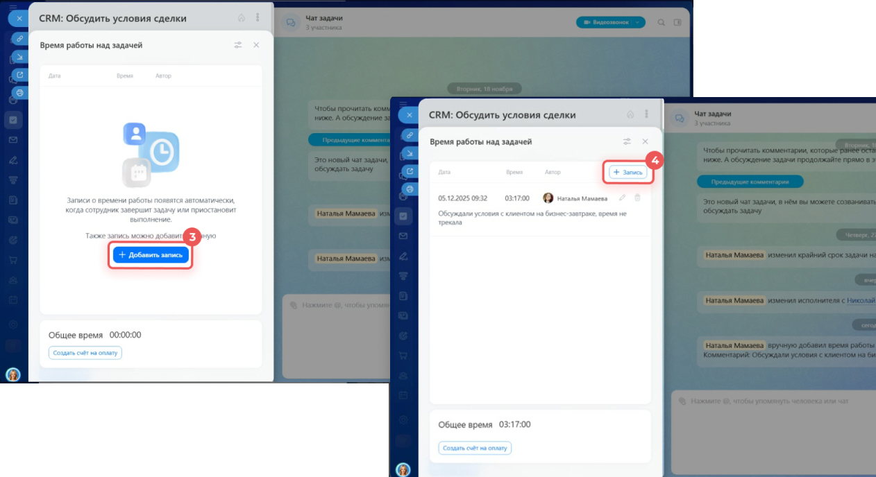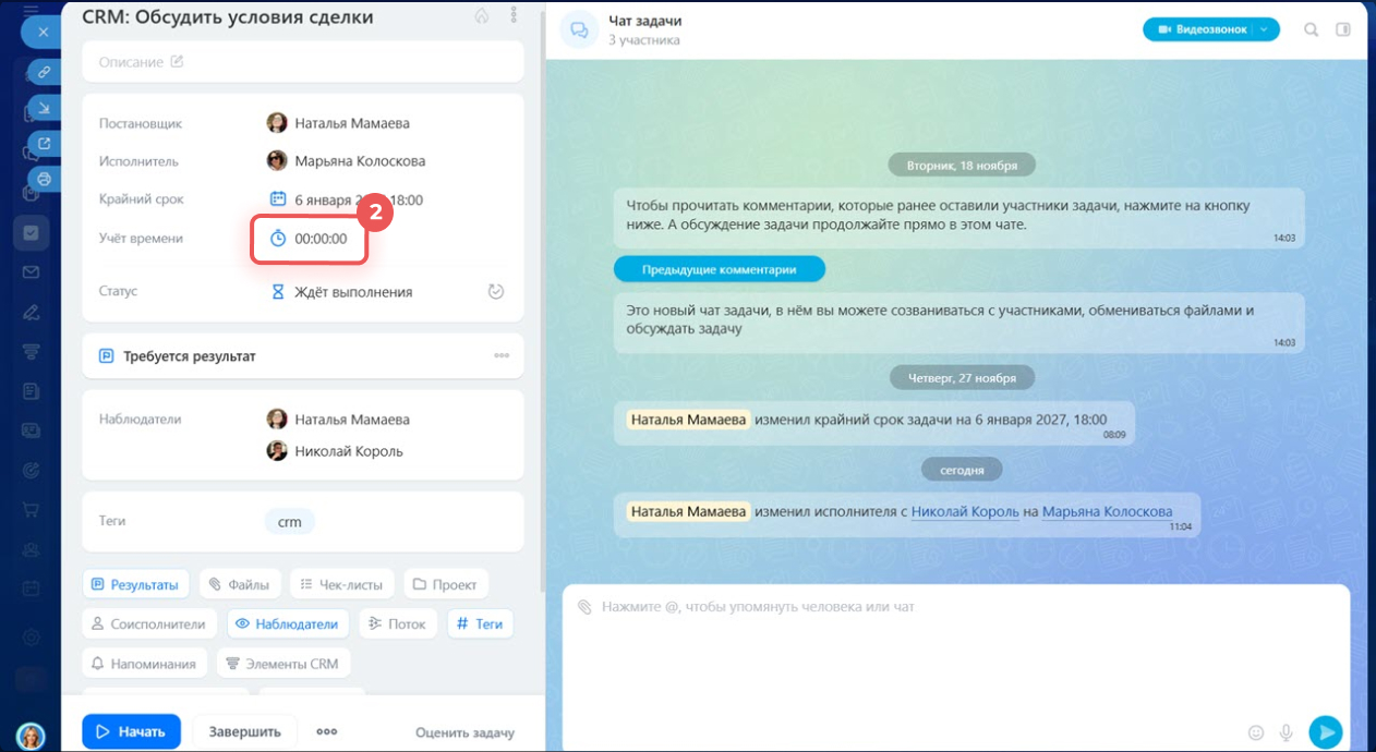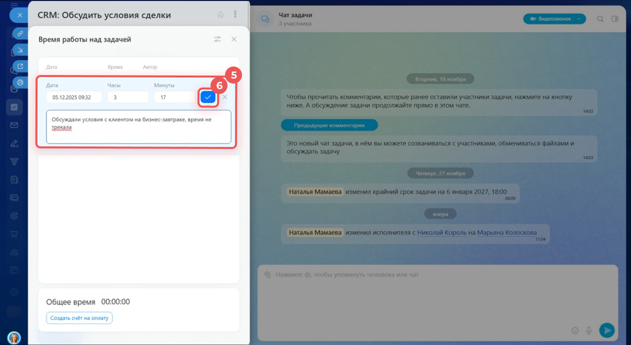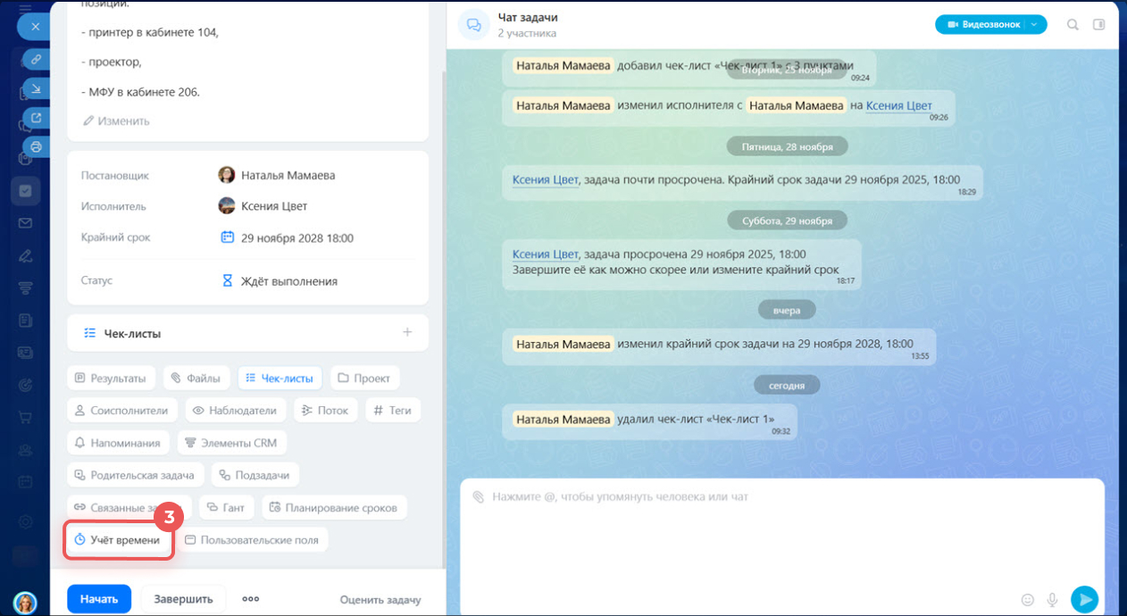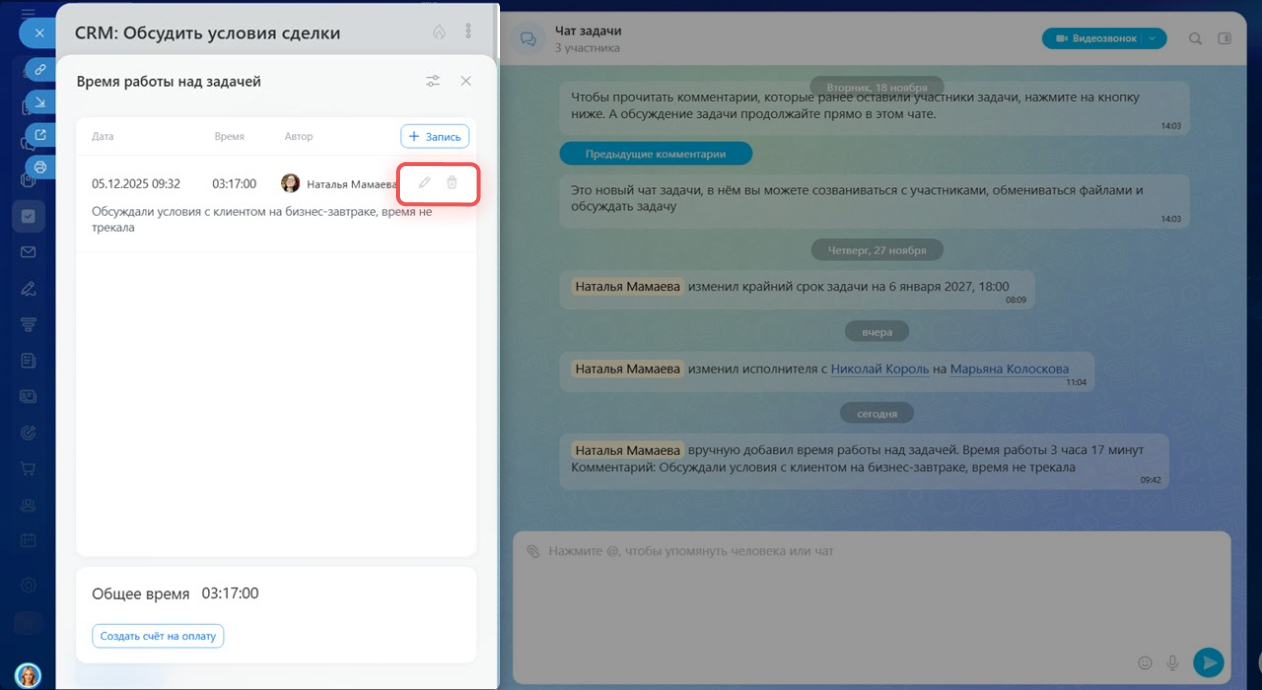 История учета времени показывает, кто, когда и как долго работал над задачей. Посмотреть записи можно в чате задачи или ее карточке.