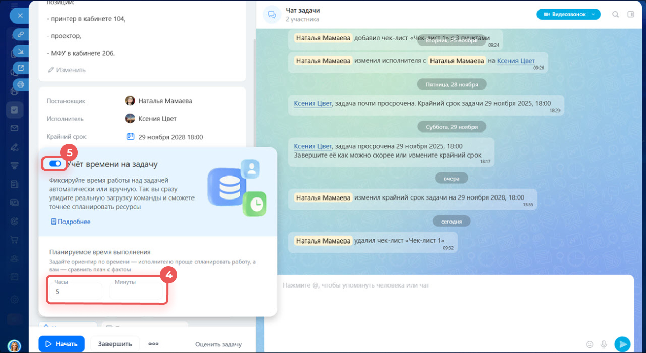 - Постановщик может включить учет времени при создании или редактировании задачи.