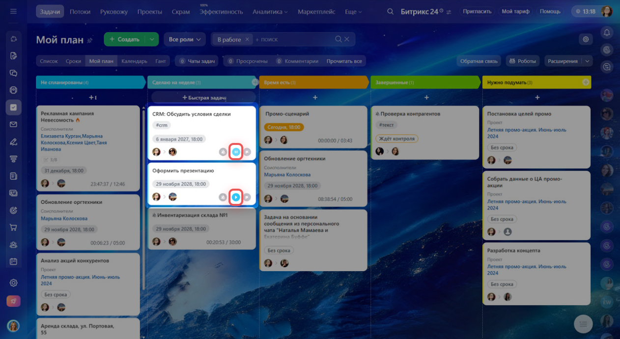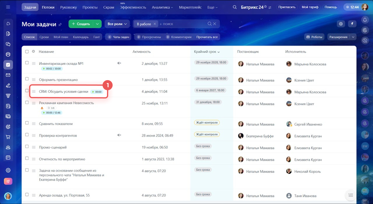 В Битрикс24 удобно отслеживать, сколько времени занимает выполнение задачи. С помощью встроенного таймера сотрудники могут фиксировать периоды, когда работают над конкретным заданием. Например, запускать его утром и ставить на паузу во время встречи или обеда.