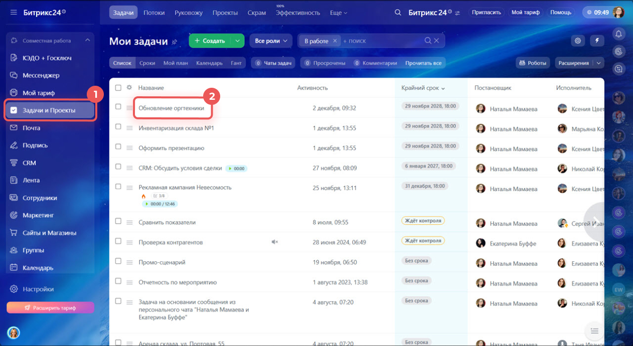 1–2. Перейдите в Задачи и Проекты, создайте новую задачу или откройте нужную.