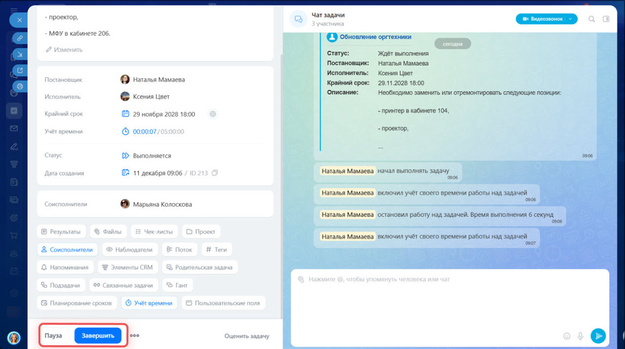 - Завершить — задача будет закрыта и учет времени прекратится.