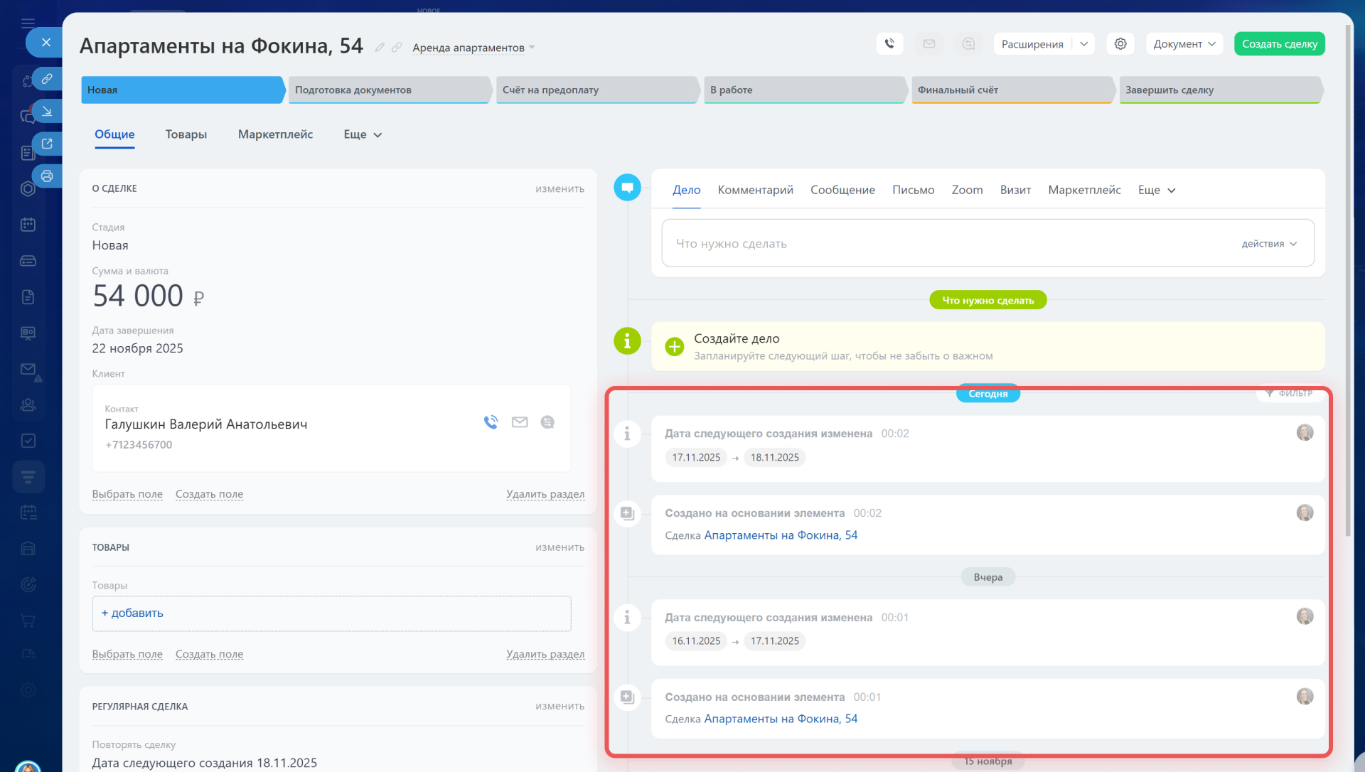 В таймлайне отображаются сделки, сформированные по этому шаблону, и дата следующего создания.