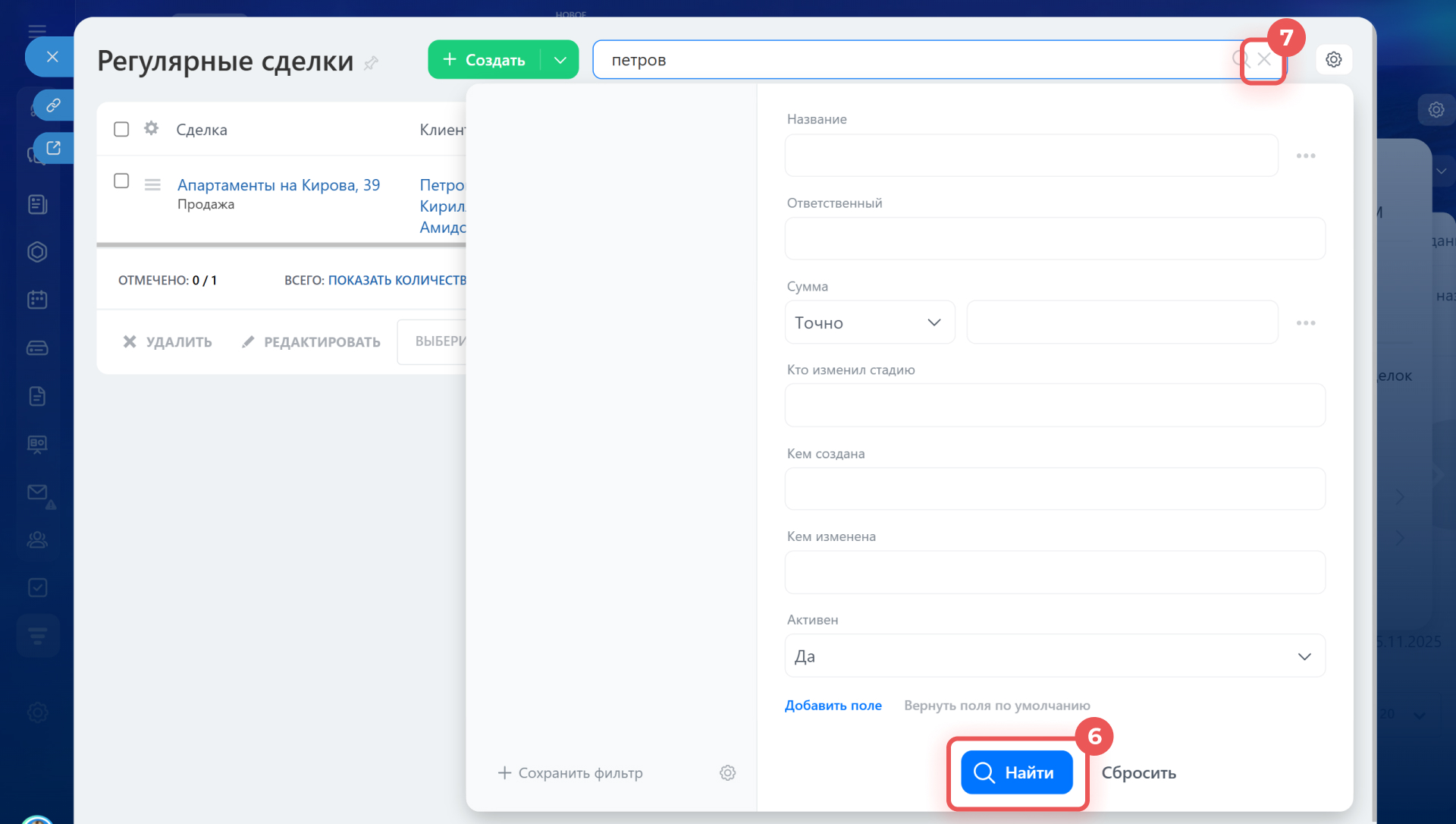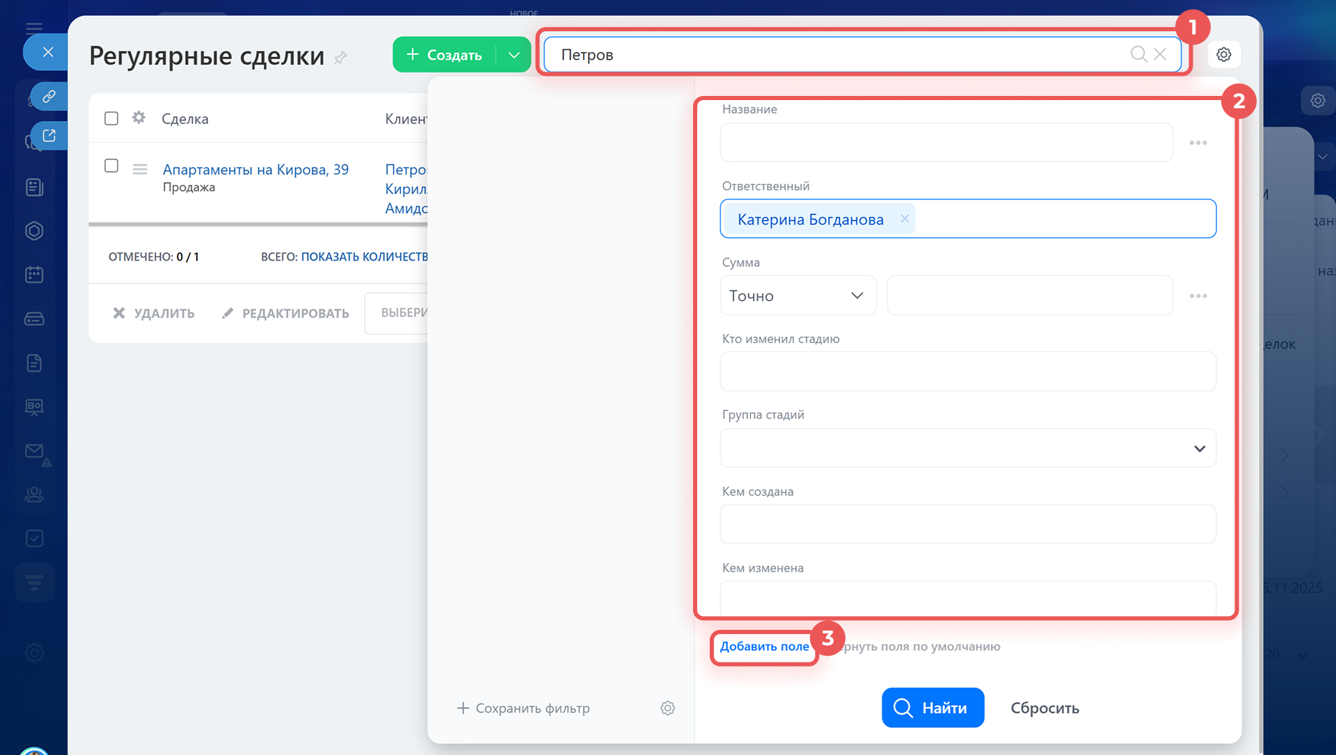 2. Если нужно сузить поиск, добавьте фильтры — снова нажмите на строку поиска и заполните поля. Например, укажите сумму сделки.