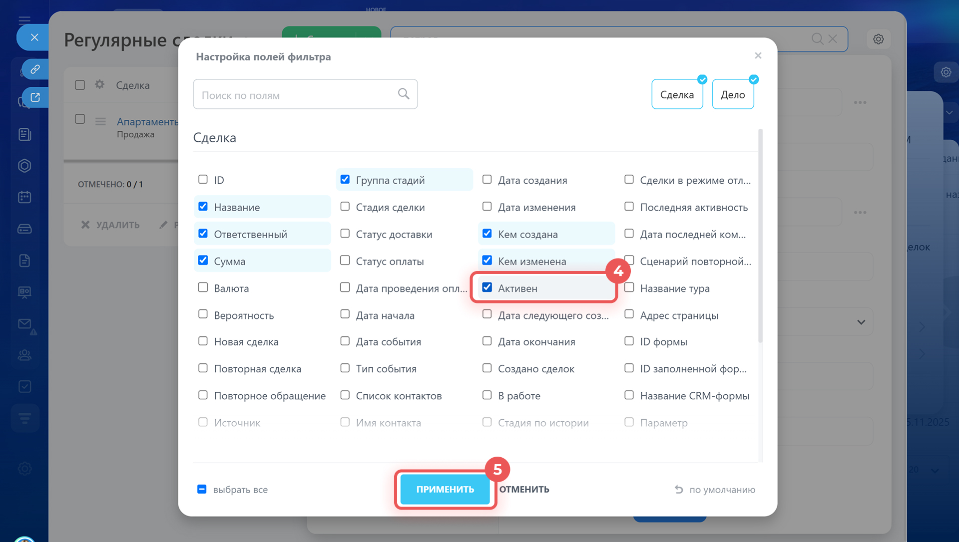 3–5. Если нужного поля нет в фильтре, нажмите Добавить поле. Отметьте его галочкой в списке и нажмите Применить.