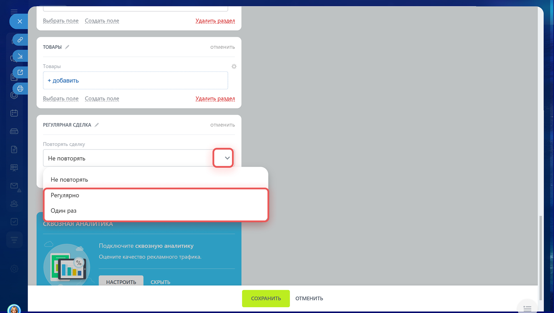 - Регулярно — CRM будет автоматически создавать сделки по расписанию. Например, каждую неделю или месяц.
