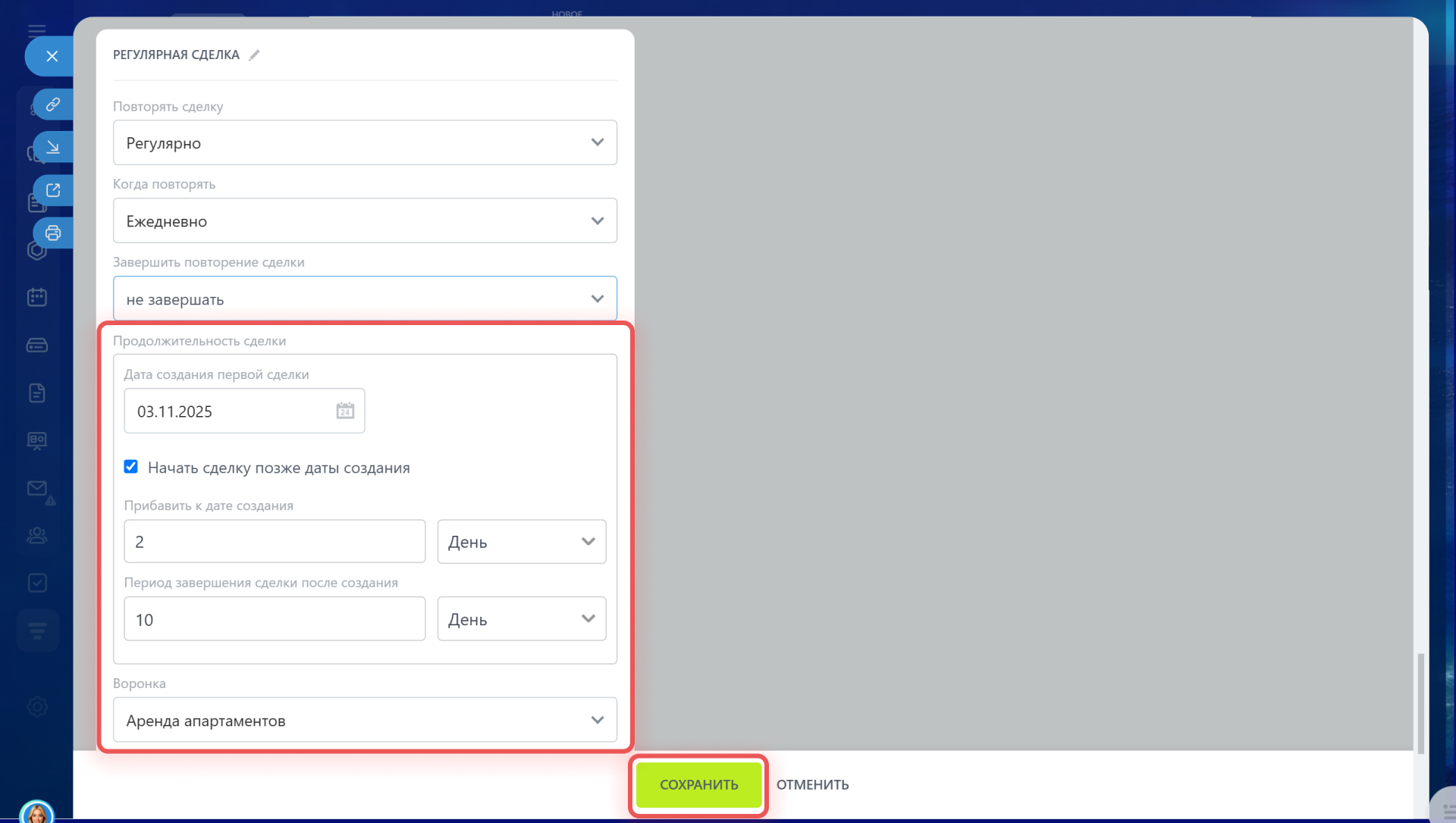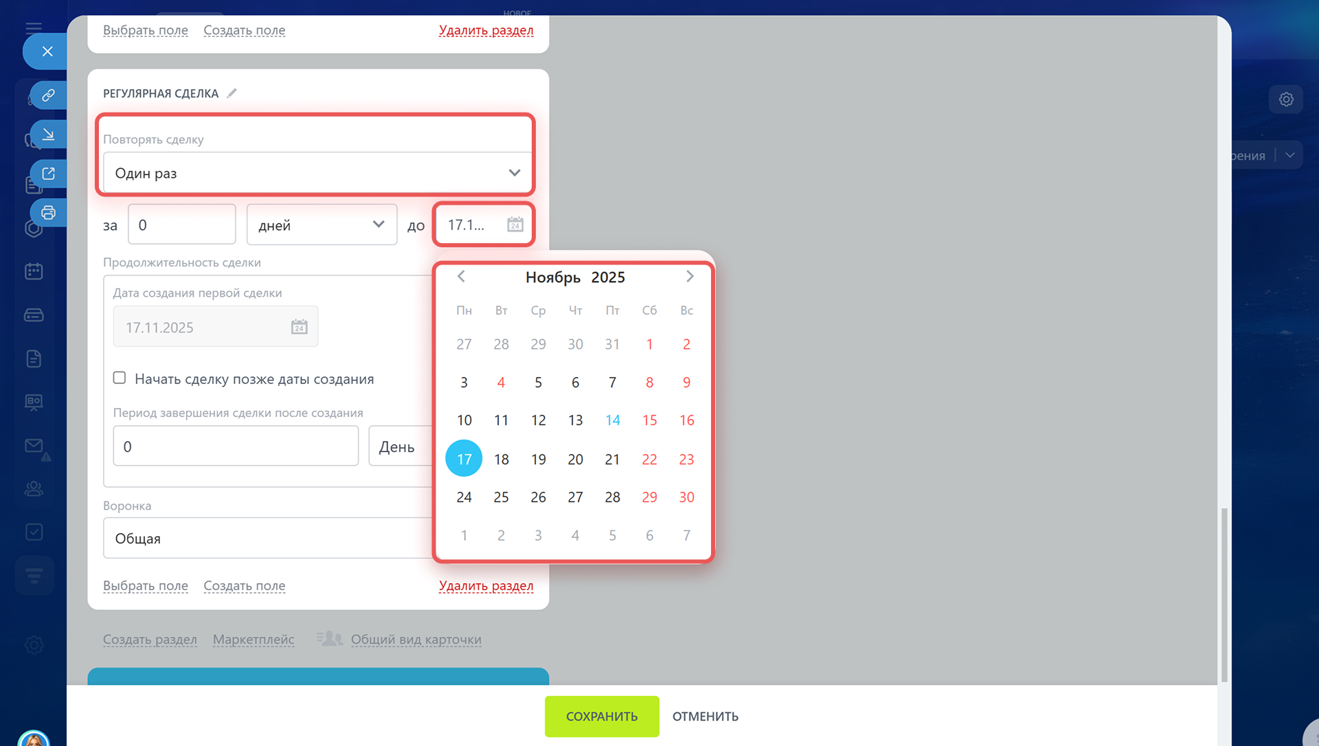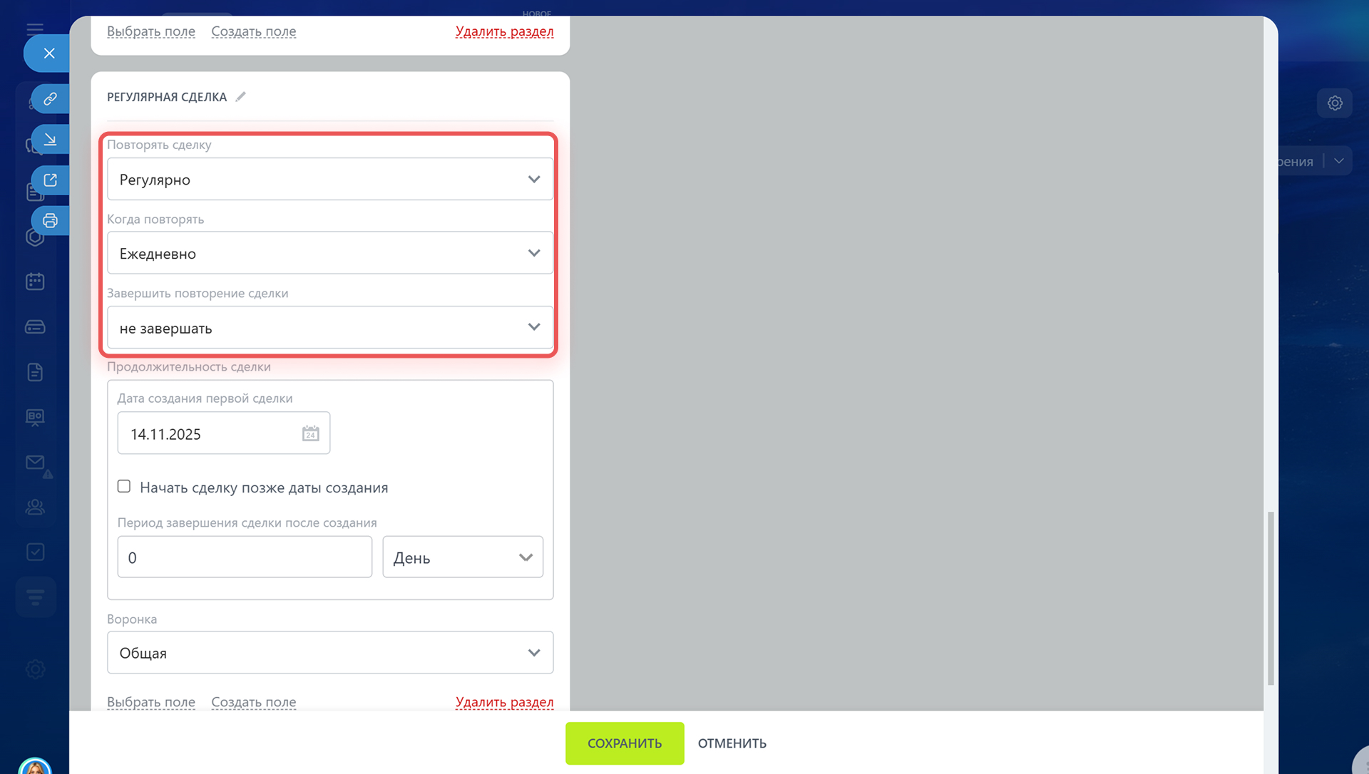 Дата создания первой сделки — укажите, когда CRM автоматически создаст первую регулярную сделку.