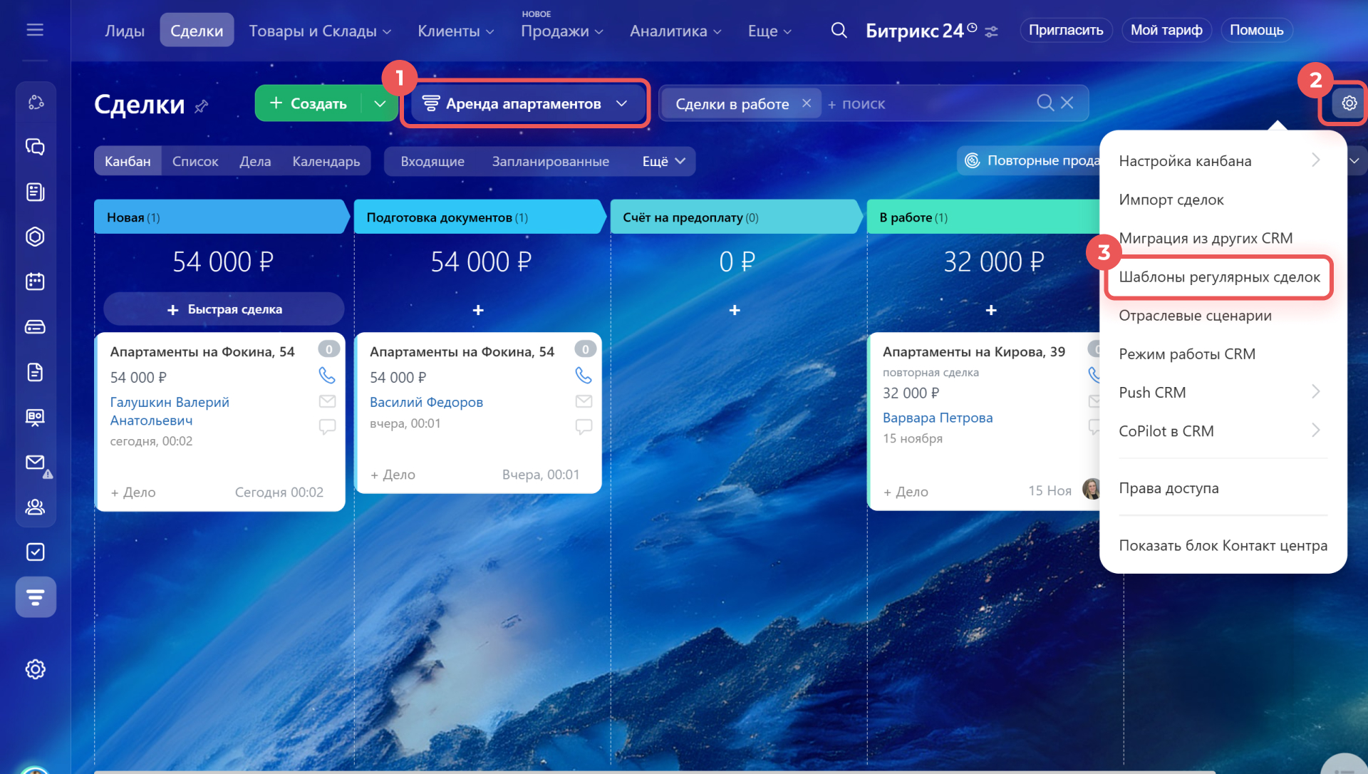 1–3. Откройте нужную воронку и перейдите в Настройки (⚙️) > Шаблоны регулярных сделок.