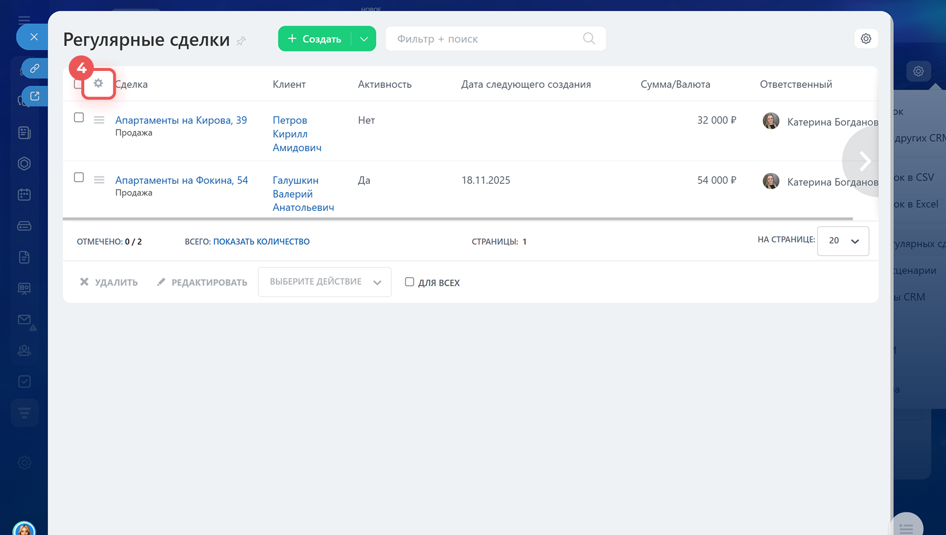 - Чтобы открыть список регулярных сделок, перейдите в нужную воронку и нажмите Настройки (⚙️) > Шаблоны регулярных сделок. Здесь можно узнать основную информацию о шаблонах, найти нужный, посмотреть, отредактировать или удалить его.