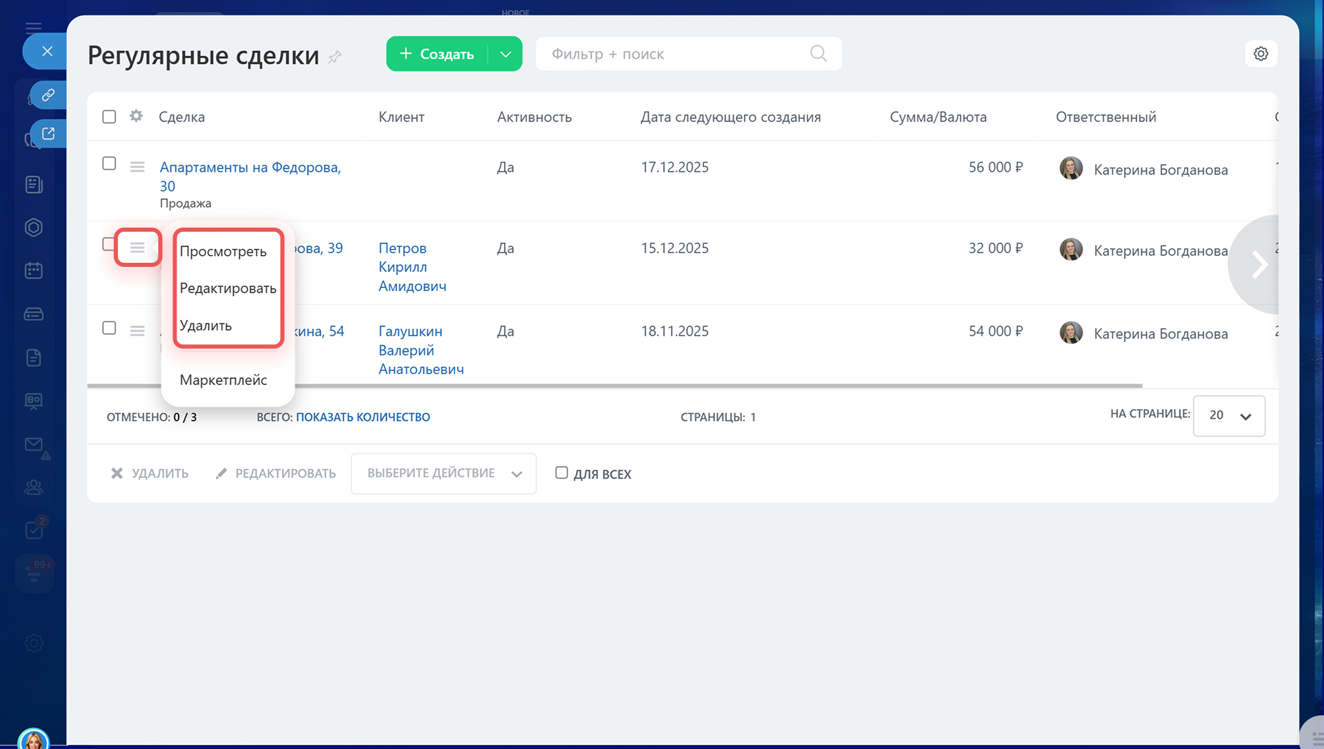 Регулярные сделки удобны при работе с постоянными клиентами — например, при ежемесячном обслуживании, аренде или поставках. CRM создает такие сделки автоматически — по расписанию, которое вы задаете. Это помогает вовремя связываться с клиентами и снижать рутину.