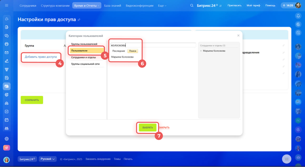 8. Выберите право доступа Сотрудник или руководитель подразделения — оно работает по-разному в зависимости от роли пользователя в структуре компании: