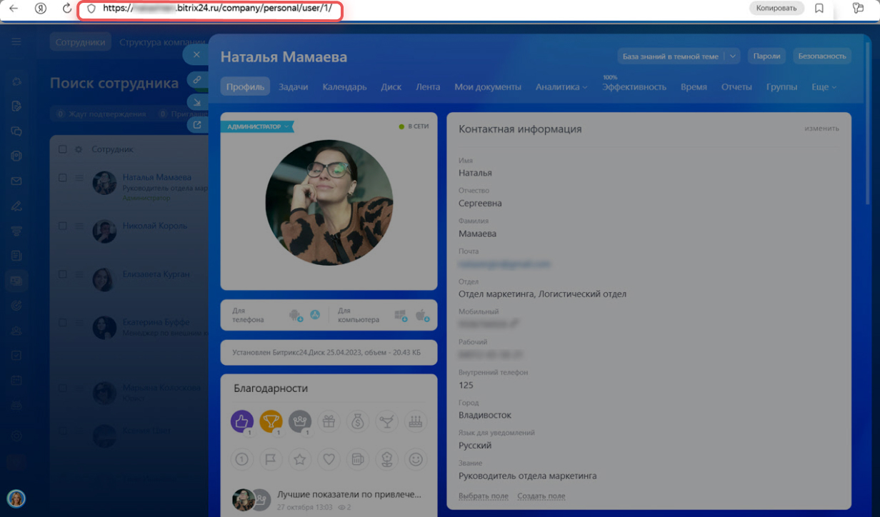 В профиле сотрудника. Если работаете в Битрикс24 в браузере, откройте профиль сотрудника — его ID будет указан в адресной строке после /user/. Например, в ссылке https://testbitrix.ru/company/personal/user/1/ ID — 1.