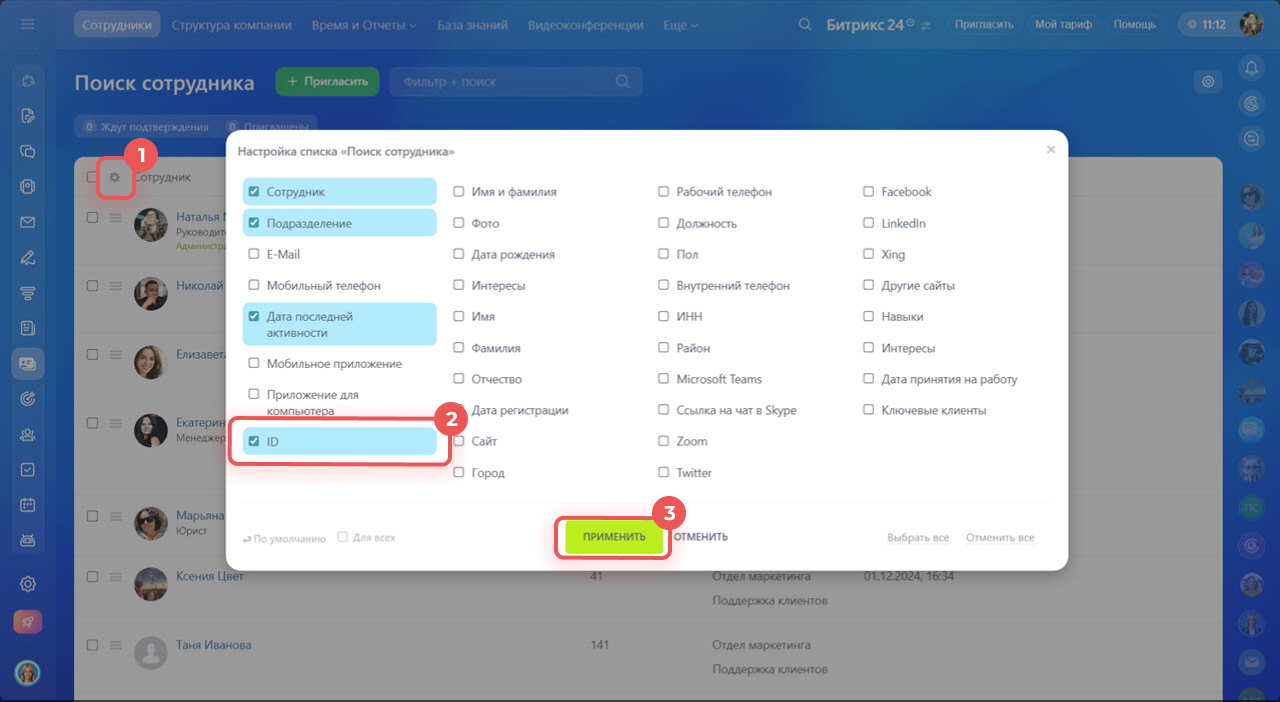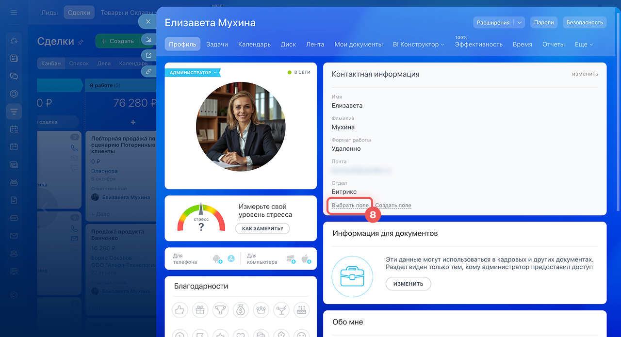 Если новое пользовательское поле не отображается в профиле сотрудника, его нужно включить в настройках показа полей. Это может сделать только администратор Битрикс24.