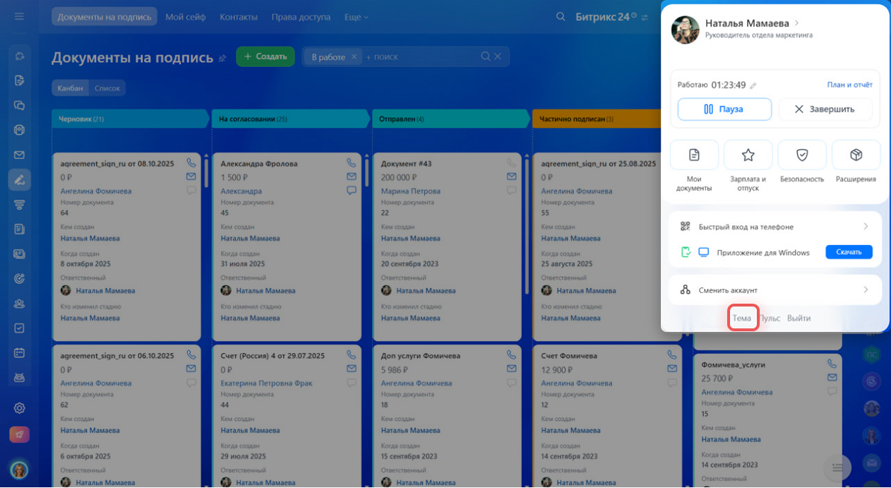 Вы можете вернуть прежнюю тему или установить новую именно для себя. Перейдите в виджет сотрудника и выберите Тема.