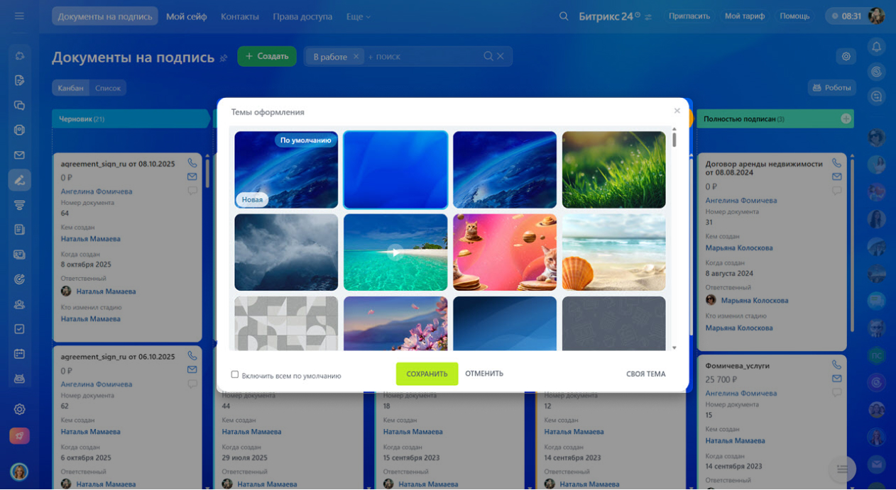 Корпоративная тема. Администратор Битрикс24 может включить общий фон для всех сотрудников. Если администратор обновит корпоративную тему, она изменится у всех автоматически.