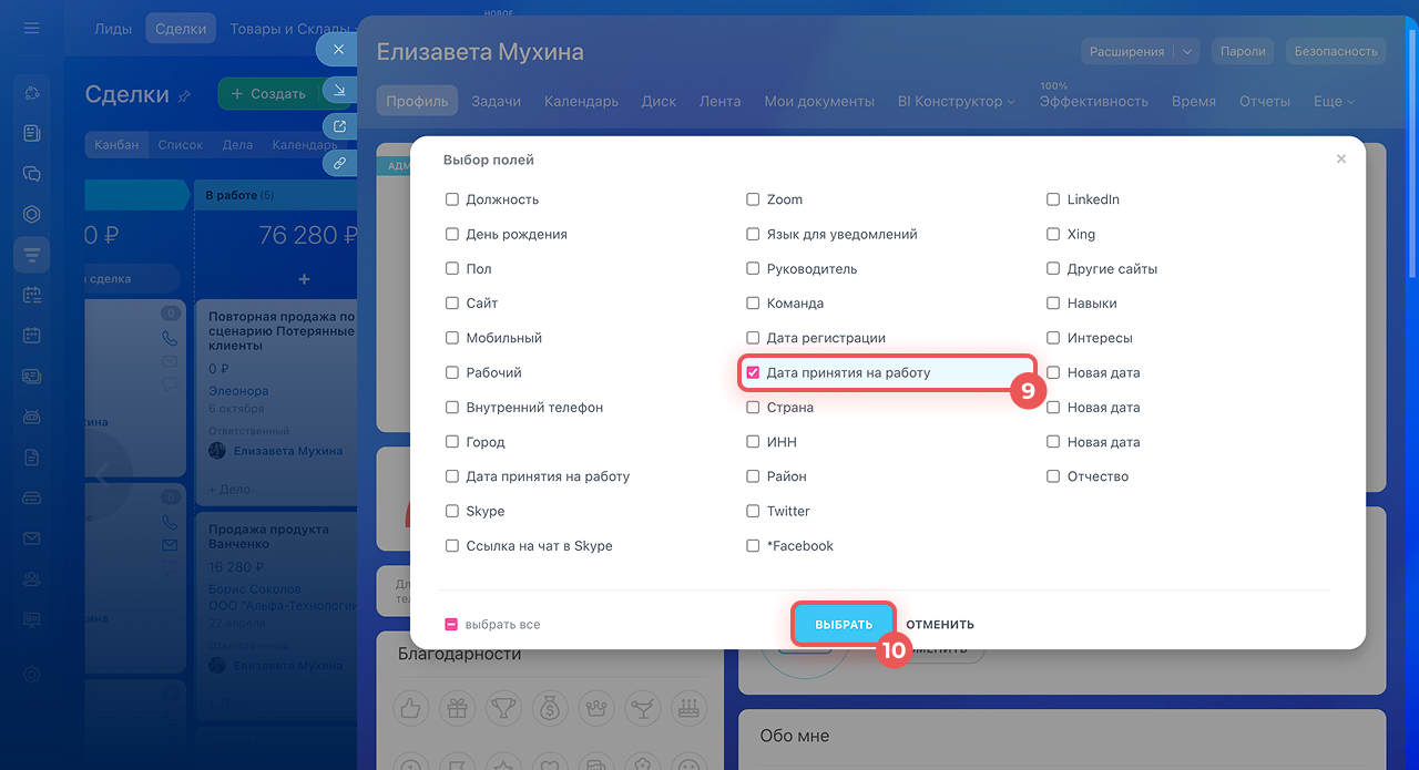 8–10. Нажмите Выбрать поле и добавьте поле. Сохраните изменения.