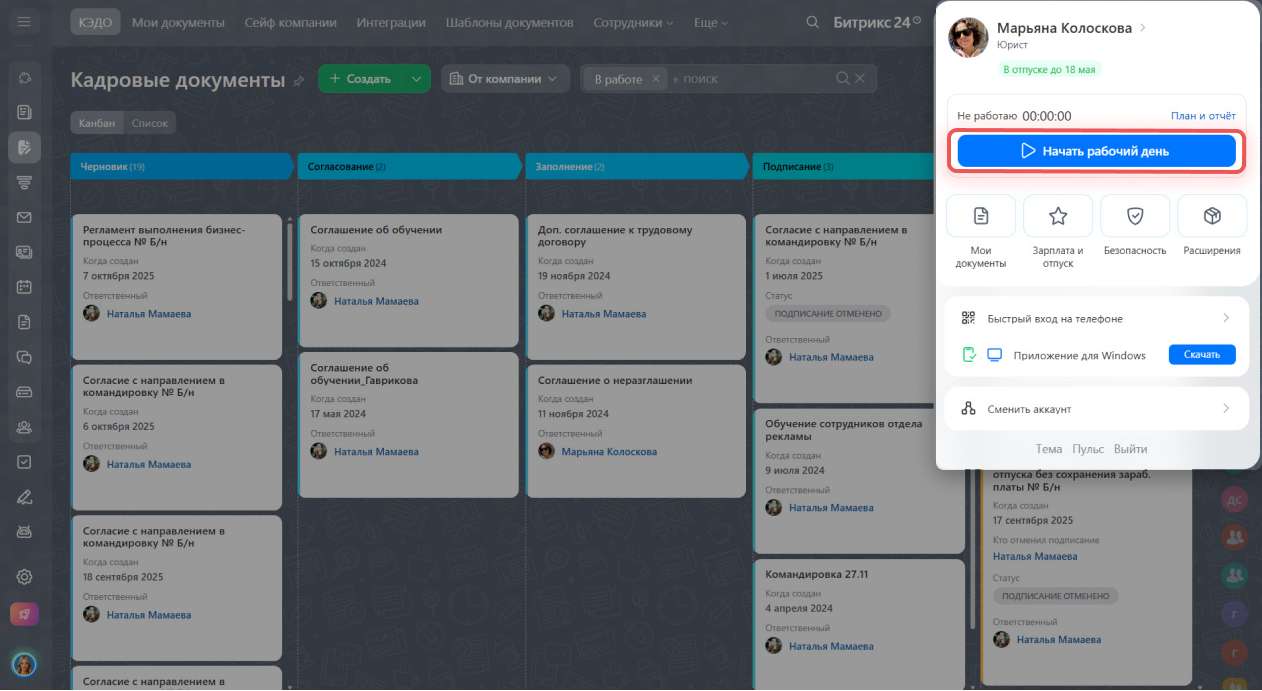 Проблема. В виджете сотрудника нет кнопки Начать рабочий день.