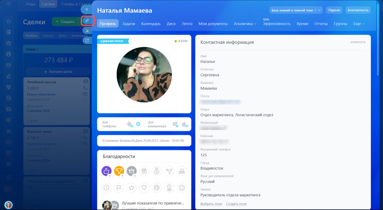 Если работаете в приложении Битрикс24 на компьютере, откройте профиль сотрудника и нажмите на скрепку слева от аватара. Чтобы увидеть ID, вставьте ссылку в любой текстовый редактор. Например, в ссылке https://testbitrix.ru/company/personal/user/12345/ ID — 12345.