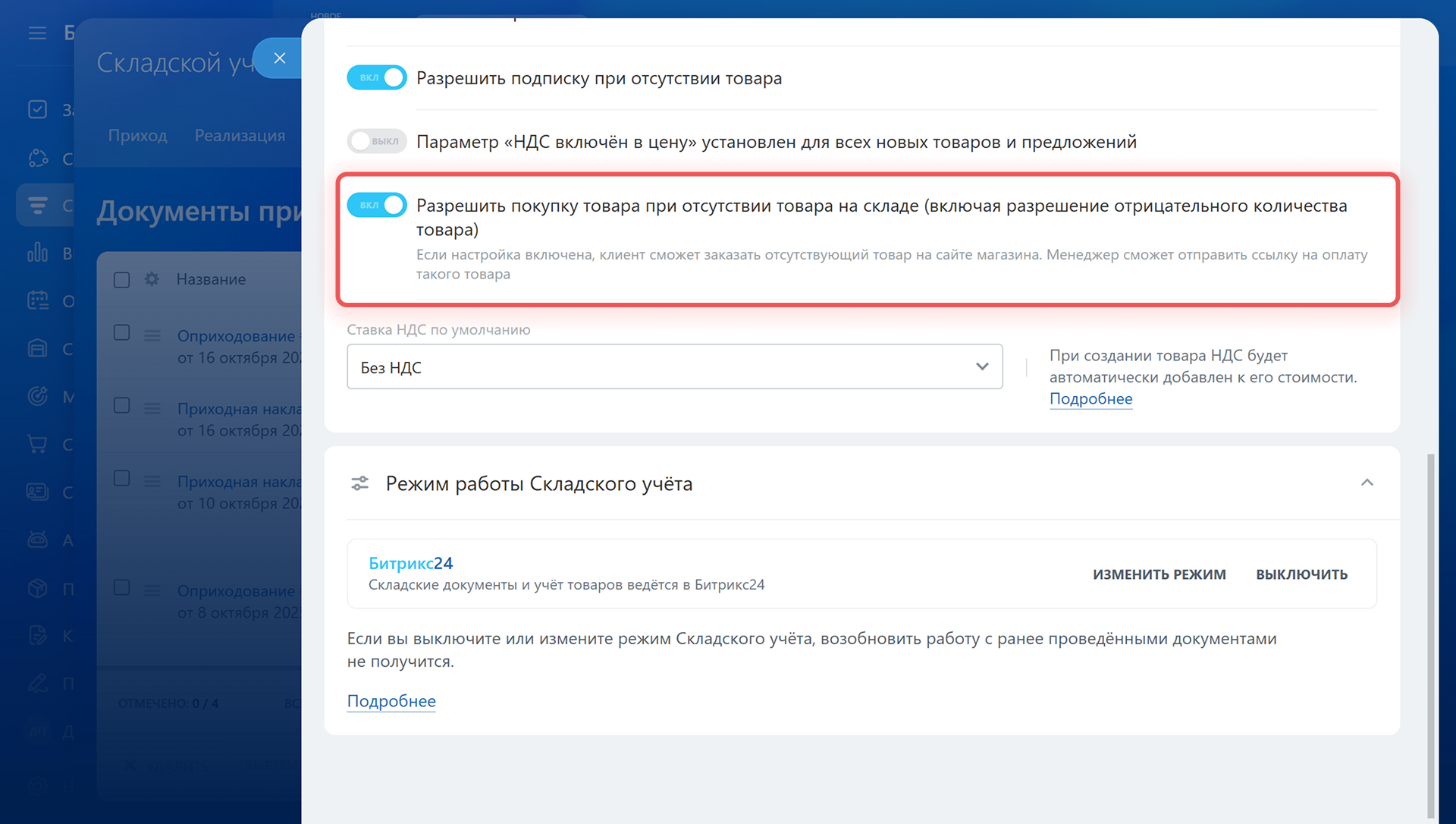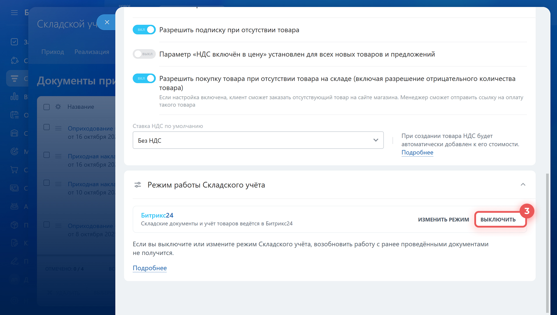 Отключение режима Битрикс24. Удаляются все складские документы и остатки товаров. При повторном включении вы не сможете продолжить работу с ранее проведенными документами. Это нужно, чтобы учет работал правильно и данные не дублировались. Отключение поможет сбросить данные, если начали с тестирования складского учета: создавали документы, проверяли остатки и продажи.
