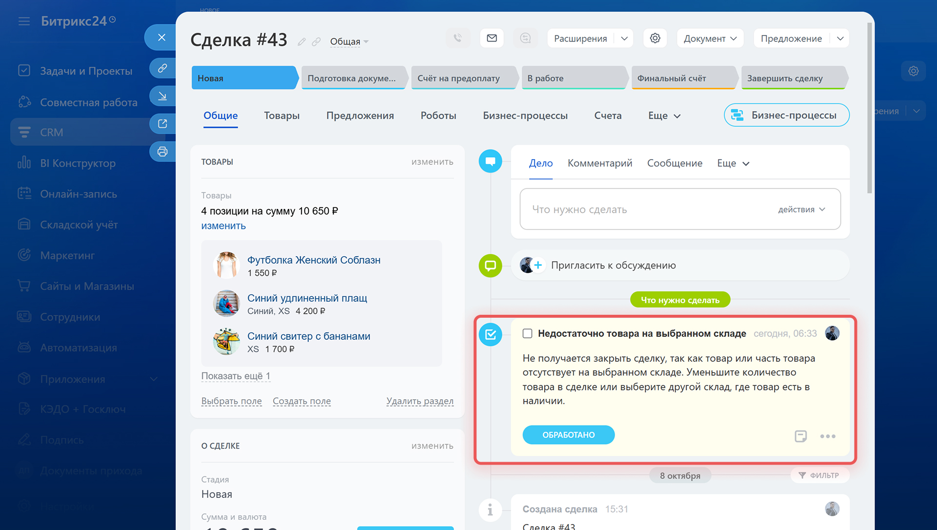 Почему сделка не закрывается с нулевым остатком. При завершении сделки Битрикс24 проверяет остатки на складе и создает документ реализации. Если товара нет, сделка не закроется: появится предупреждение о нехватке товара. Списать товар можно только, когда он есть на складе.