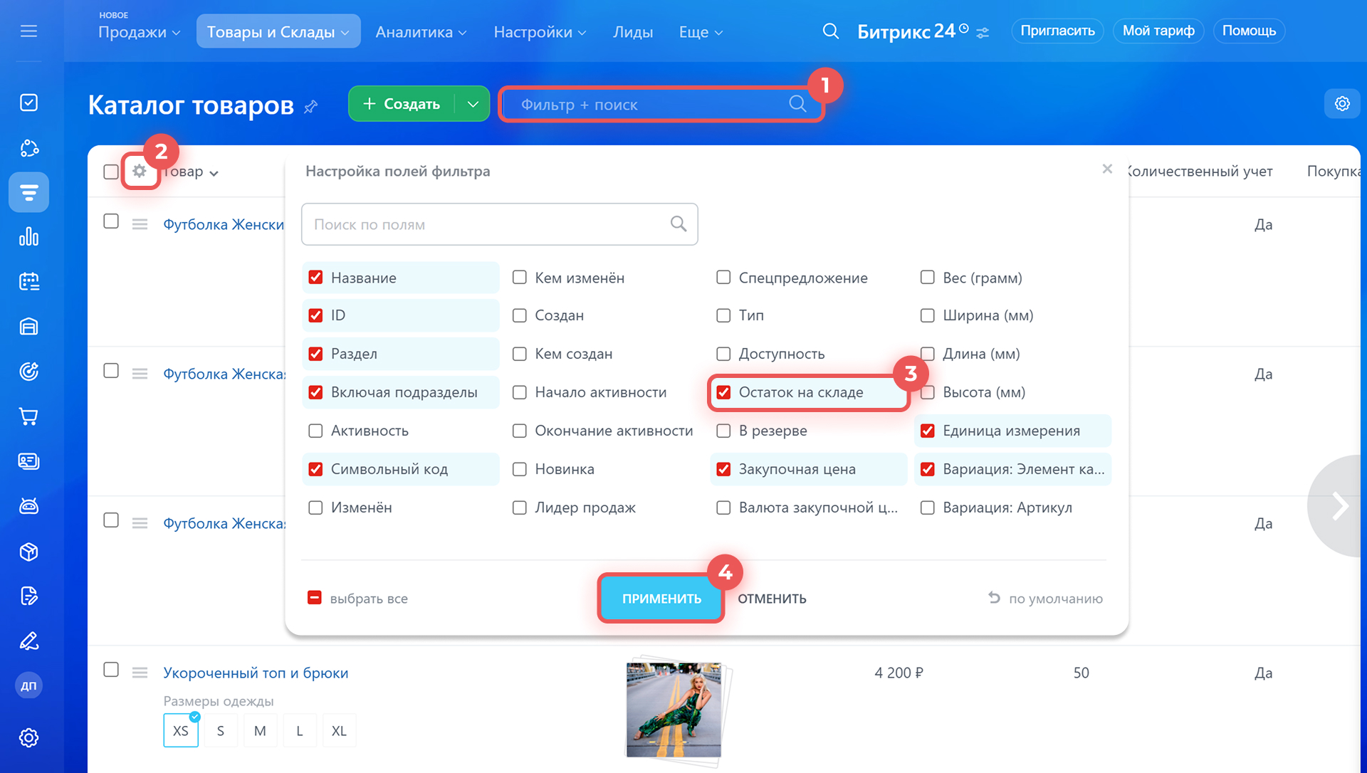2–4. Выберите поля, которые будут отображаться в списке: откройте настройки списка, отметьте Остаток на складе и другие свойства и нажмите Применить.