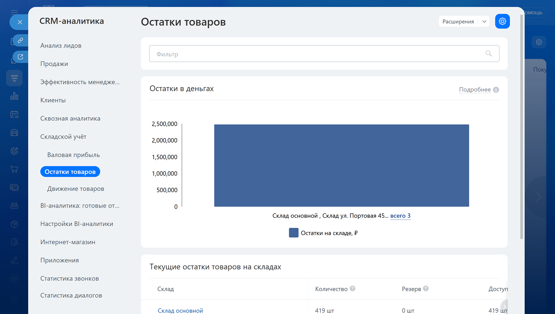 Откройте раздел Складской учет > Аналитика > Остатки товаров. В верхней части отчета увидите общую стоимость запасов по закупочным ценам. Ниже — таблицу с остатками по каждому складу.