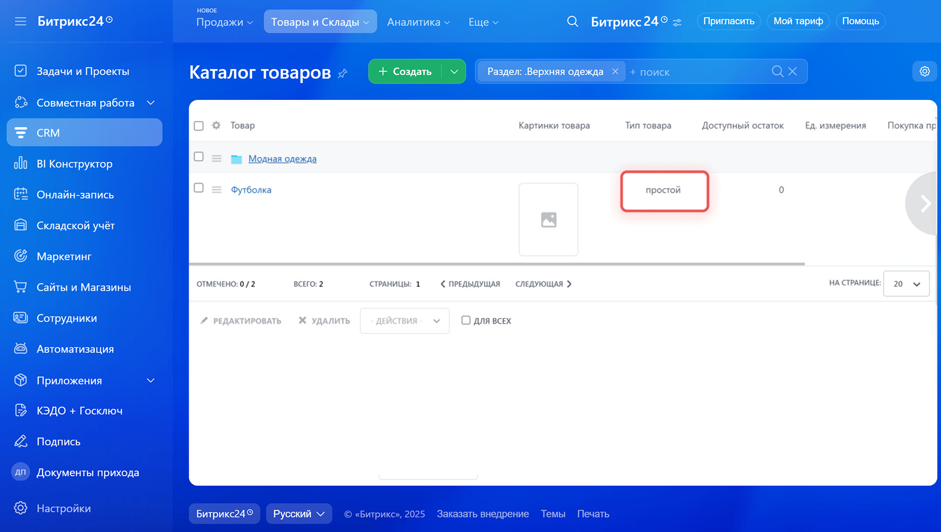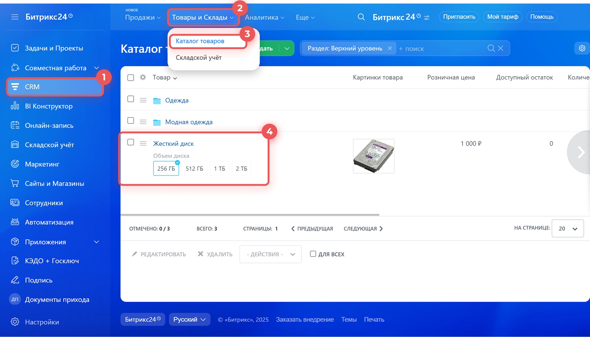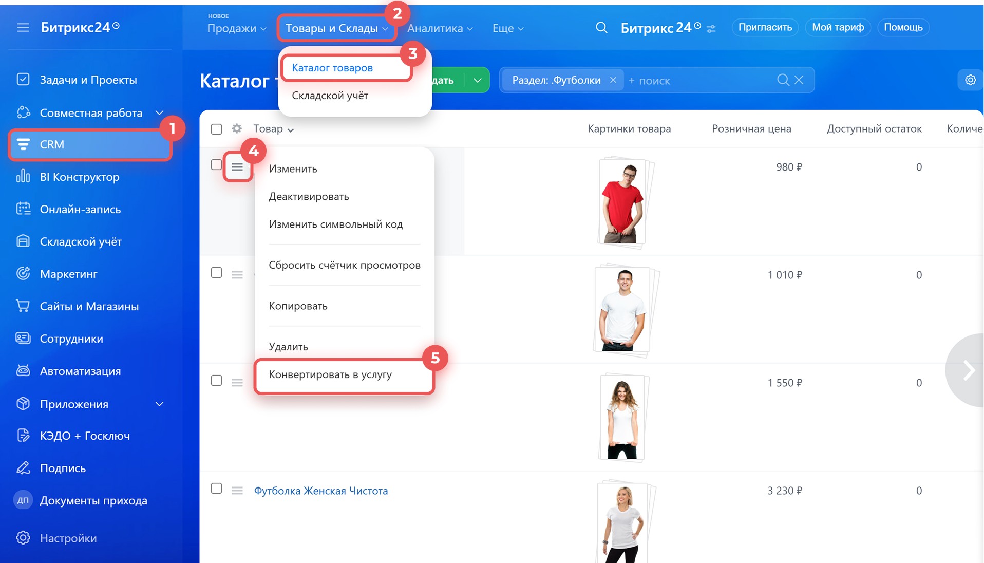 1–4. Перейдите в CRM > Товары и Склады > Каталог товаров и выберите нужный товар.