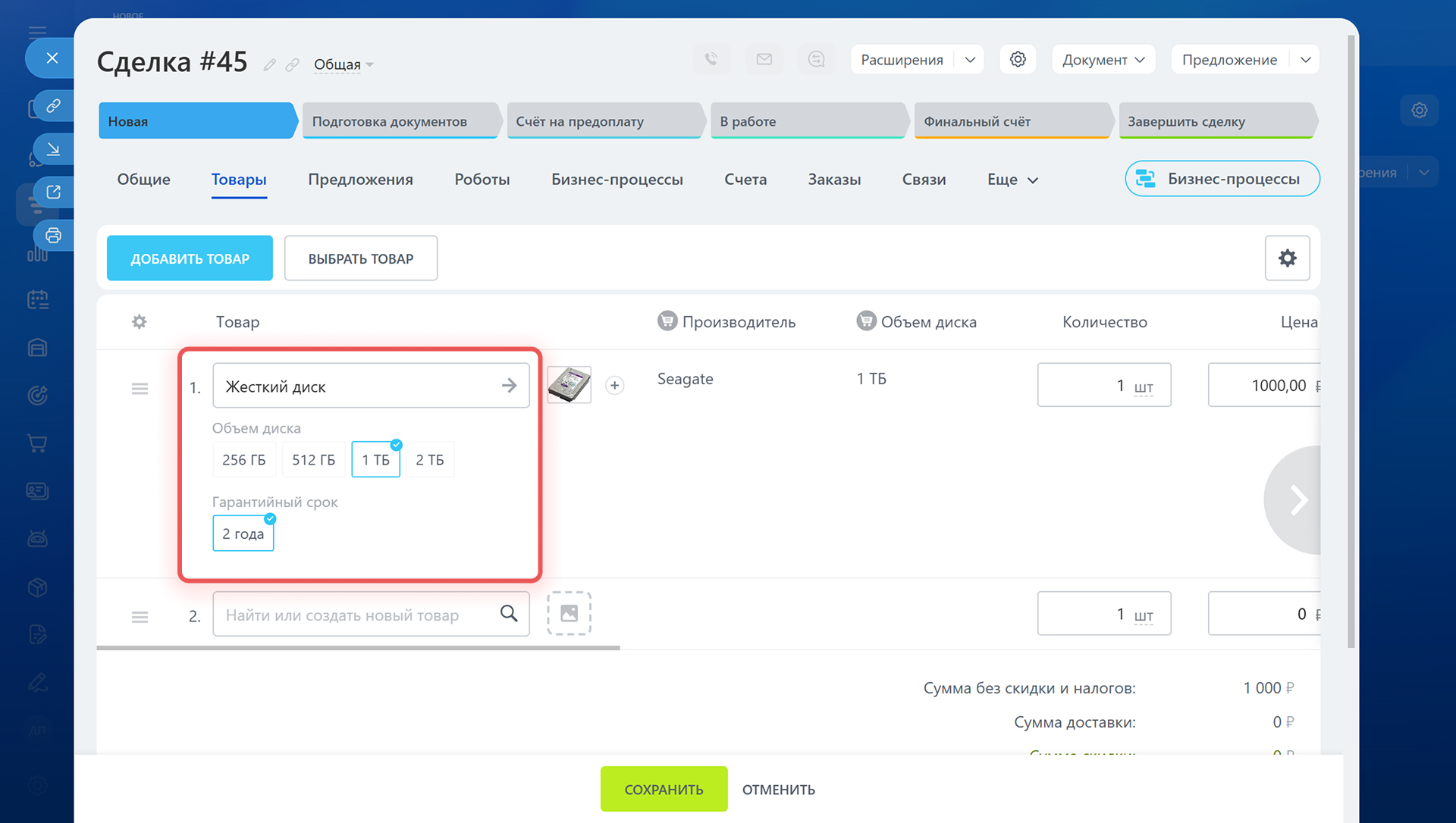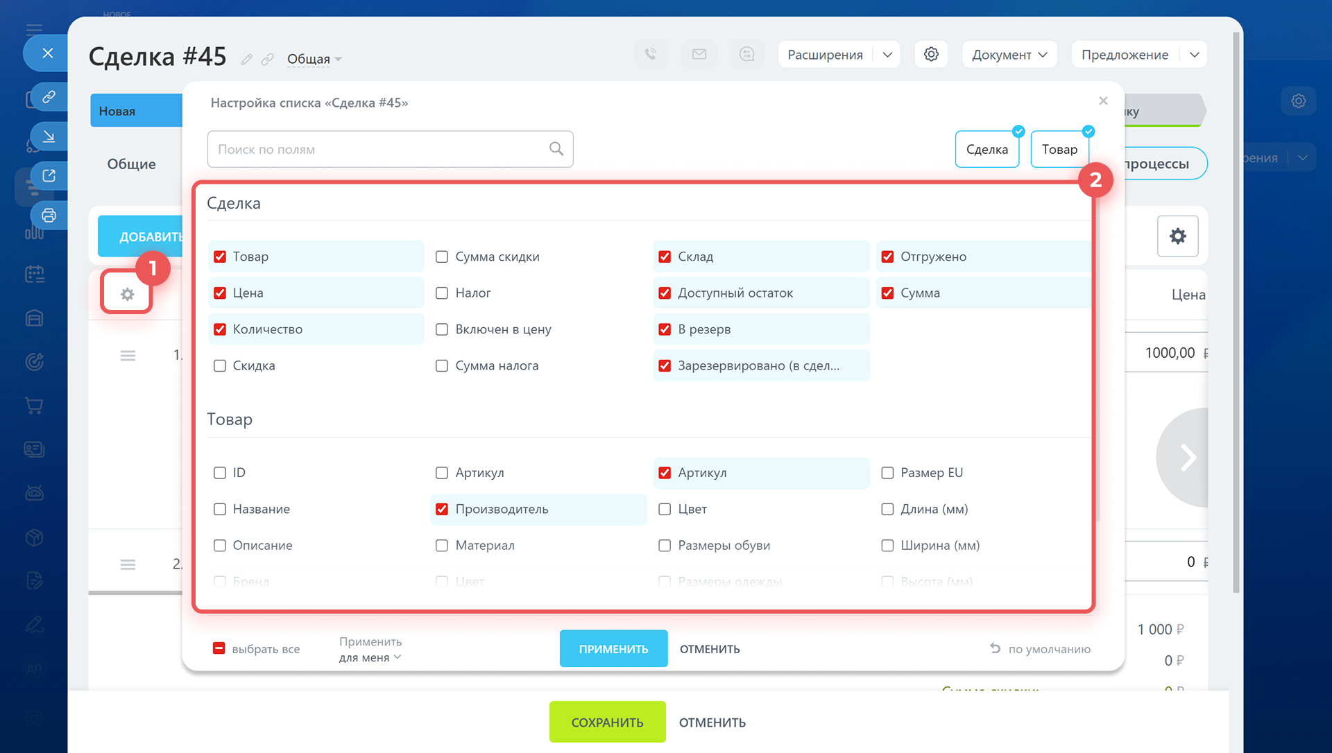 Свойства и поля товаров в карточке сделки