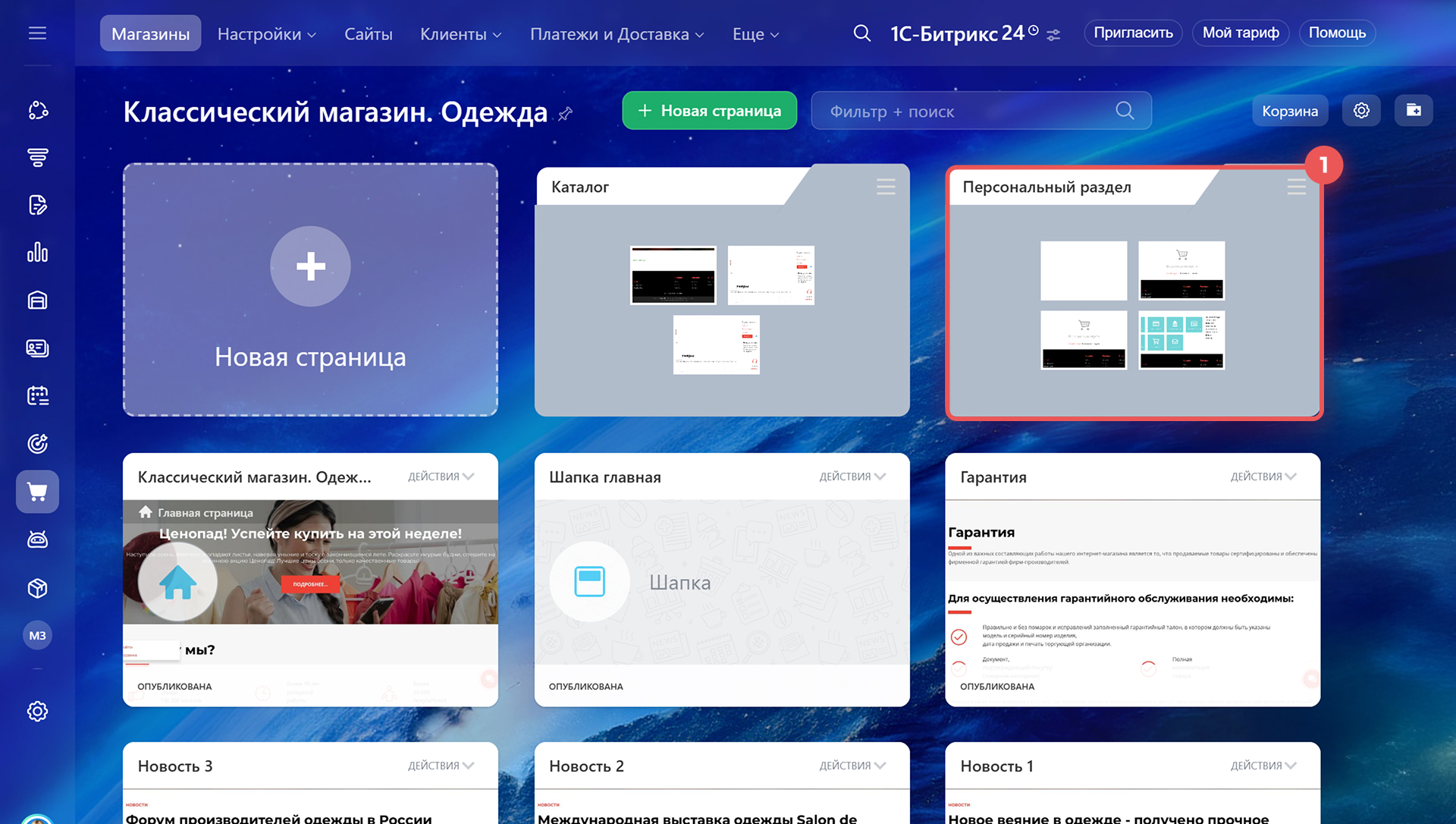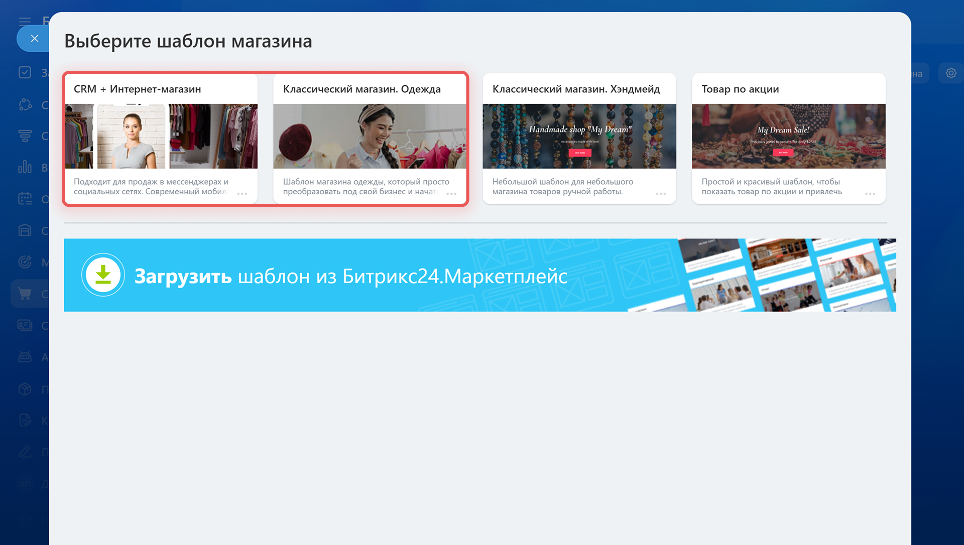 Когда запускаете магазин из шаблона «CRM + Интернет-магазин» или «Классический магазин. Одежда», Битрикс24 создает демонстрационные данные: товары, разделы каталога и примерные настройки. Эти данные помогают увидеть, как выглядит готовый магазин, и протестировать оформление заказа.