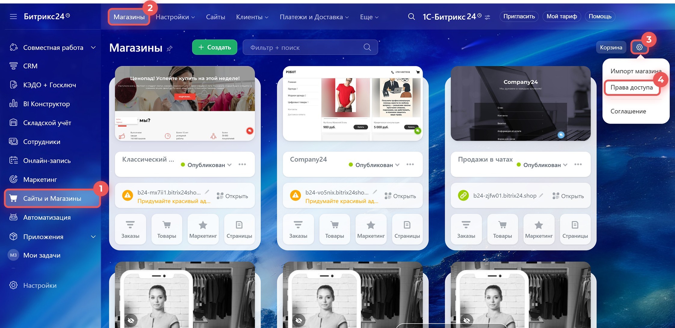 Если сотрудник не может просматривать или редактировать страницы магазина, проверьте настройки доступа. Откройте Сайты и магазины > Магазины > Настройки (⚙️) > Права доступа и посмотрите, какие права назначены пользователю или его отделу.