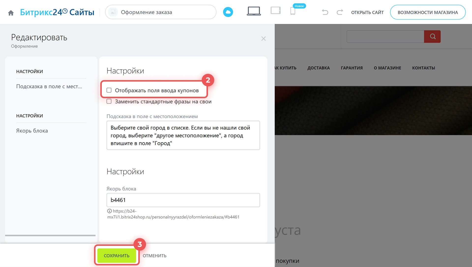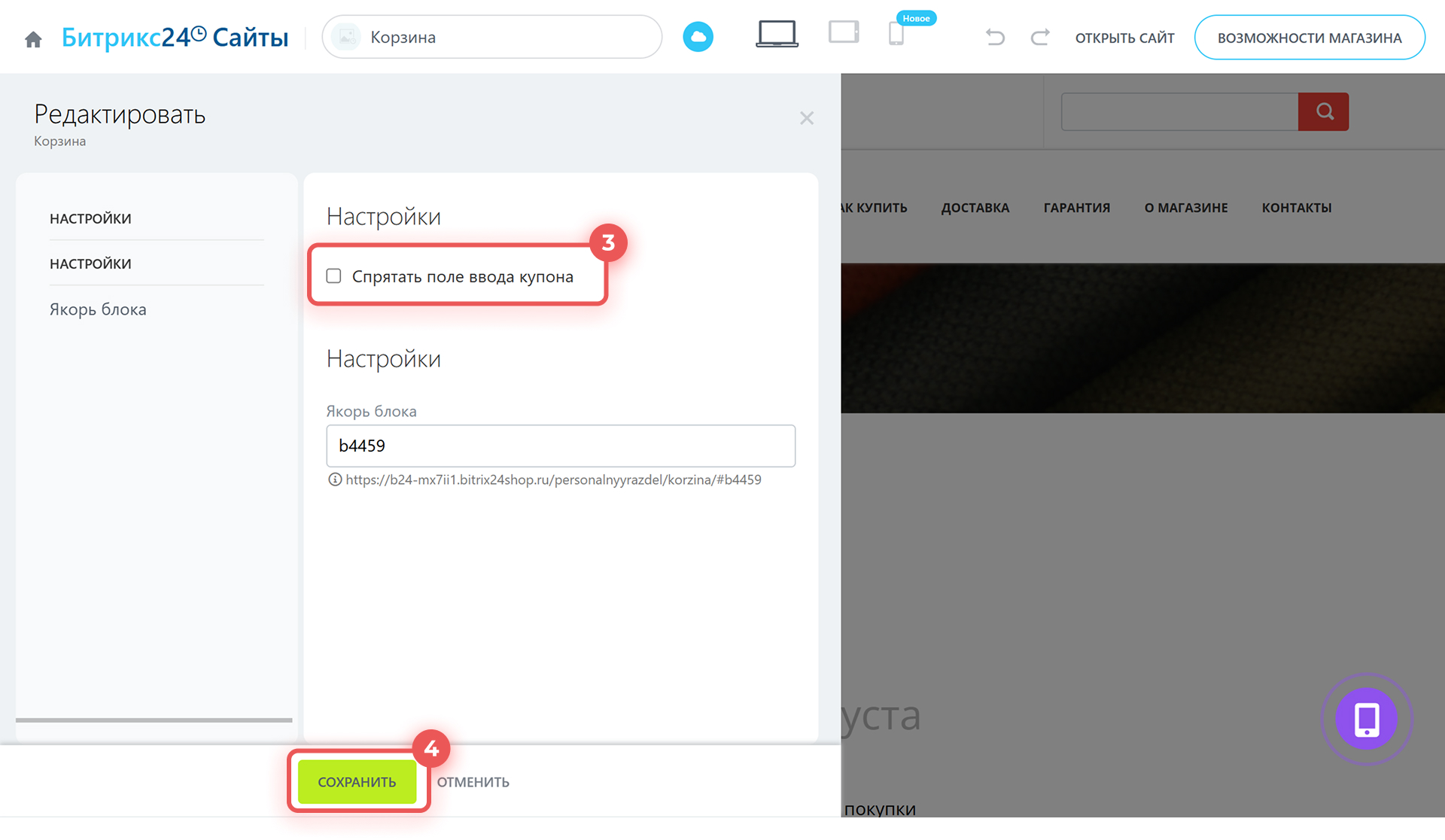 3–4. В меню редактирования блока включите параметр Спрятать поле ввода купона и сохраните изменения.