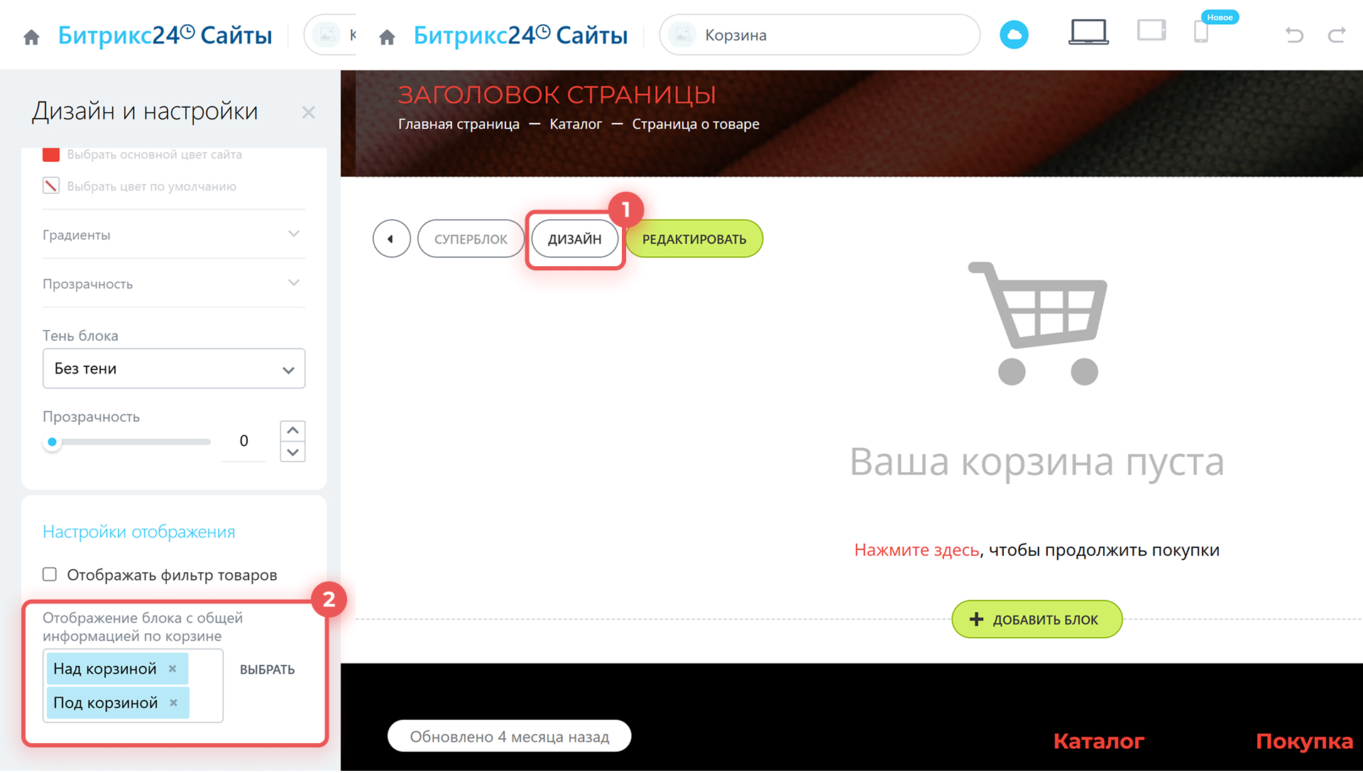 1. Откройте страницу «Корзина» вашего магазина и нажмите Дизайн.