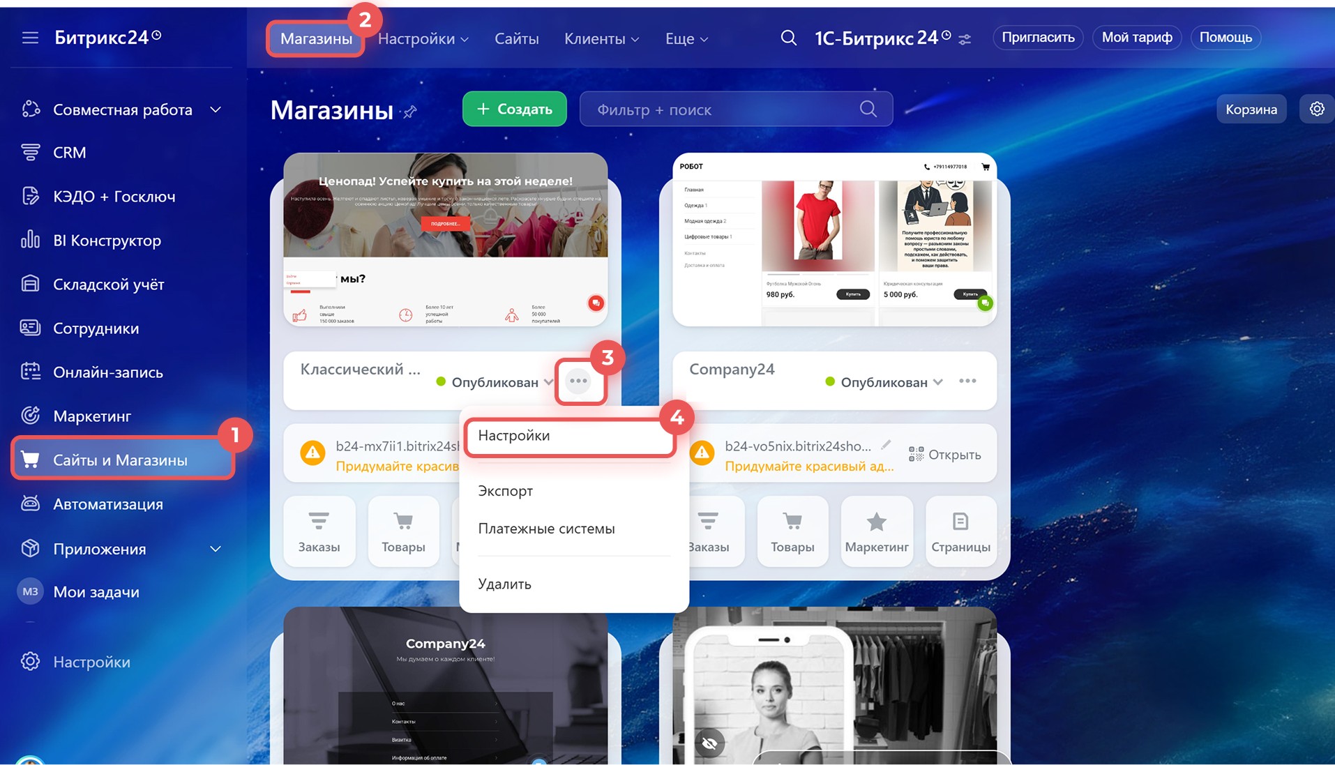 1–4. Откройте Сайты и магазины > Магазины. В карточке магазина нажмите на Три точки (…) > Настройки.