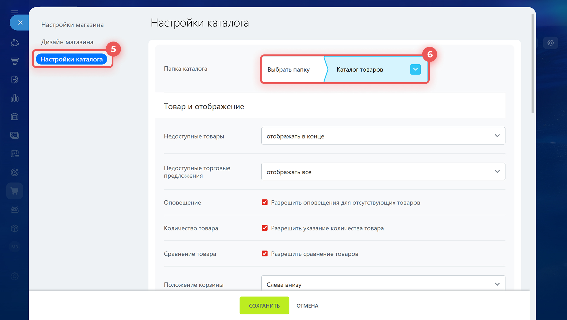 5–6. Перейдите на вкладку Настройки каталога. В поле Папка каталога выберите раздел с товарами.