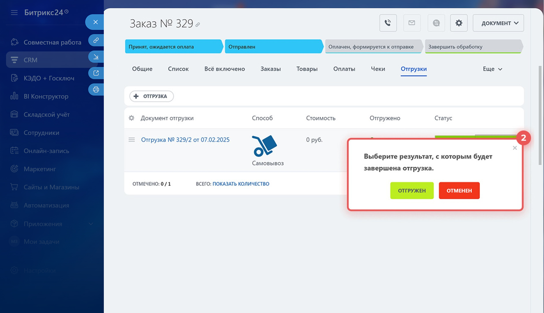 Отмените отгрузку. Откройте нужный заказ в CRM и отмените отгрузку.