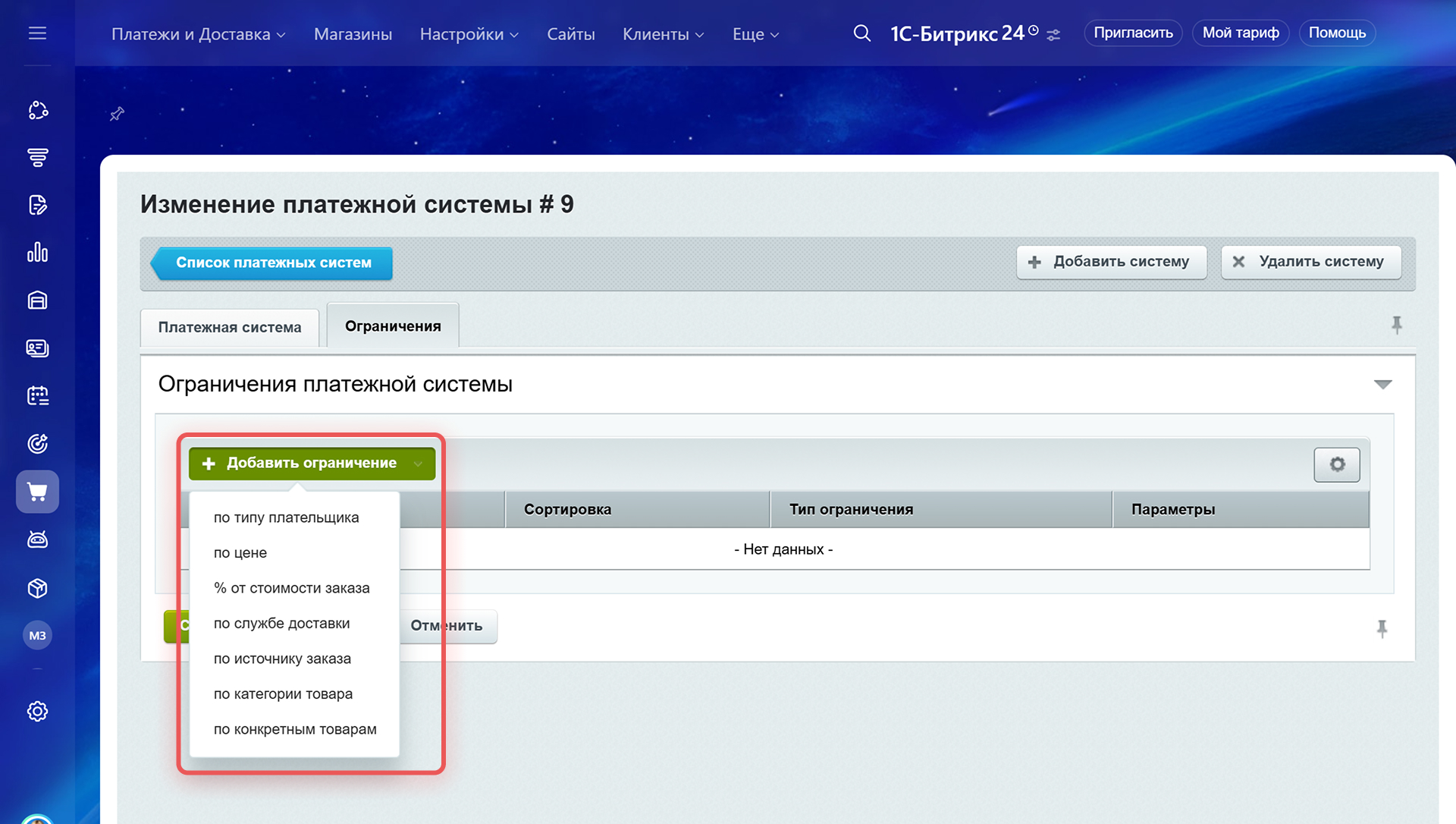 Чтобы настроить ограничения для платежных систем, перейдите в Сайты и Магазины> Платежи и Доставка > Платежные системы. Откройте нужную платежную систему и перейдите в раздел Ограничения.