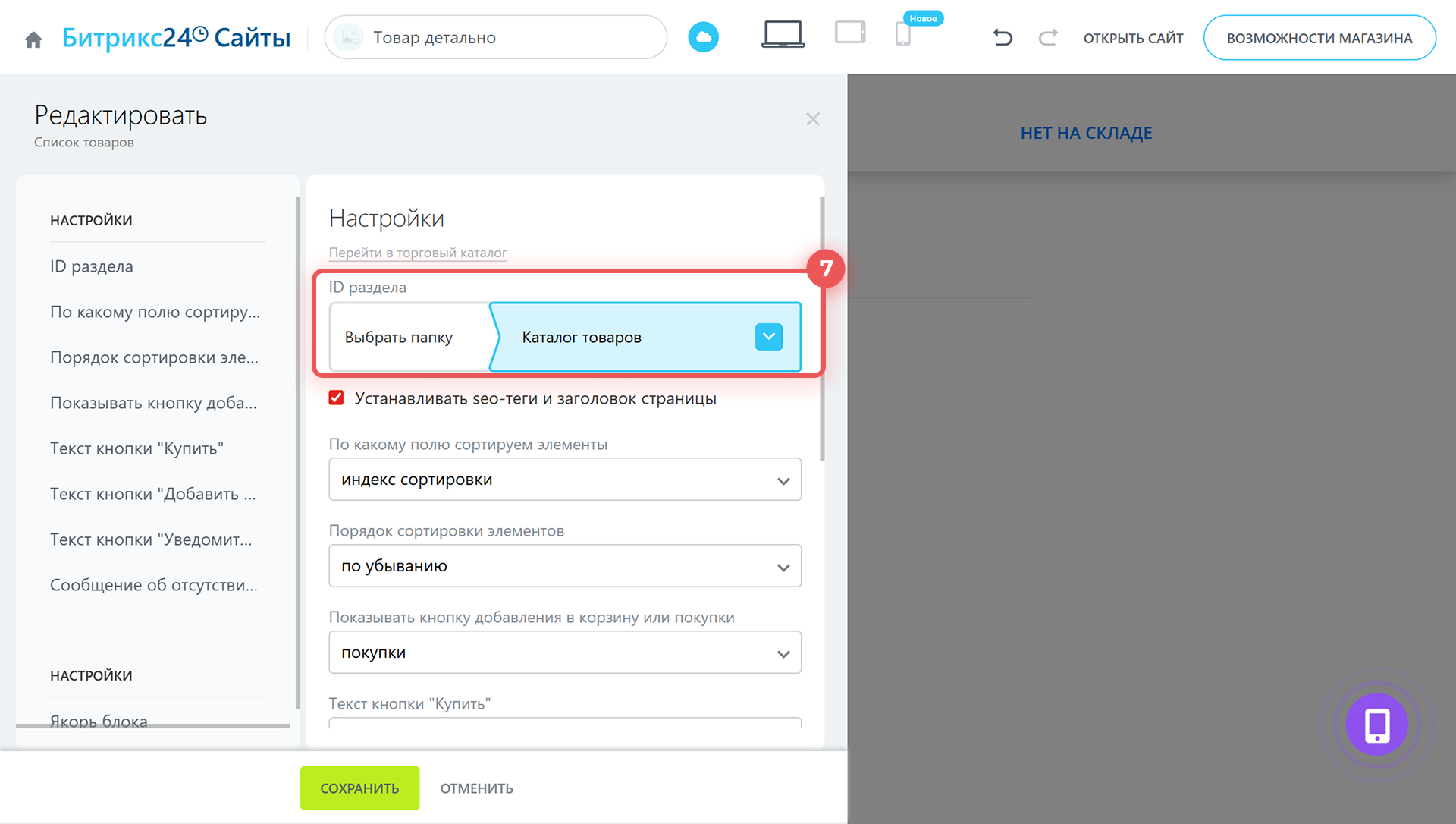 7. Откройте страницы магазина, где есть блоки с товарами. Проверьте, что для товаров указан тот же раздел, что и в настройках магазина.