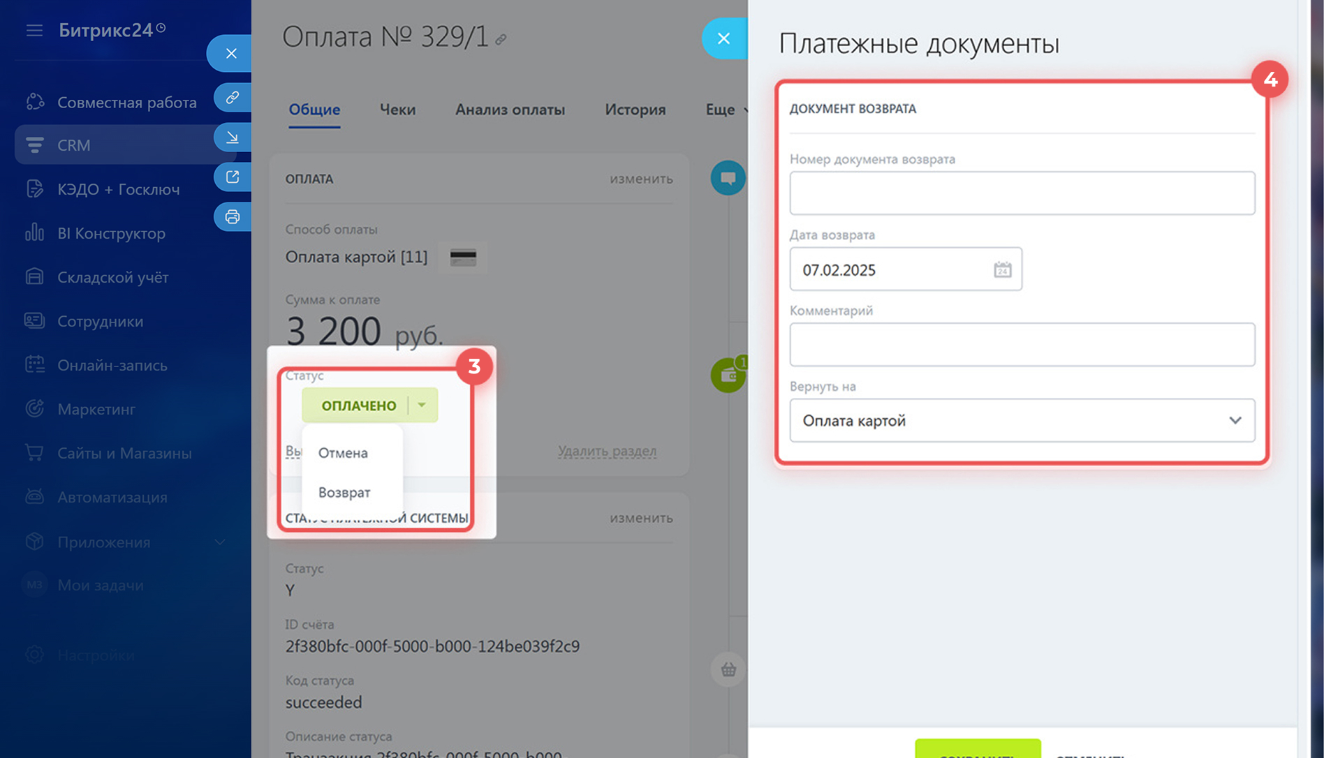 Оформите возврат оплаты. В заказе откройте вкладку Оплаты и выберите нужный документ. Установите статус оплаты Возврат и заполните данные документа возврата. Уточните у бухгалтера, какие данные нужно указать.