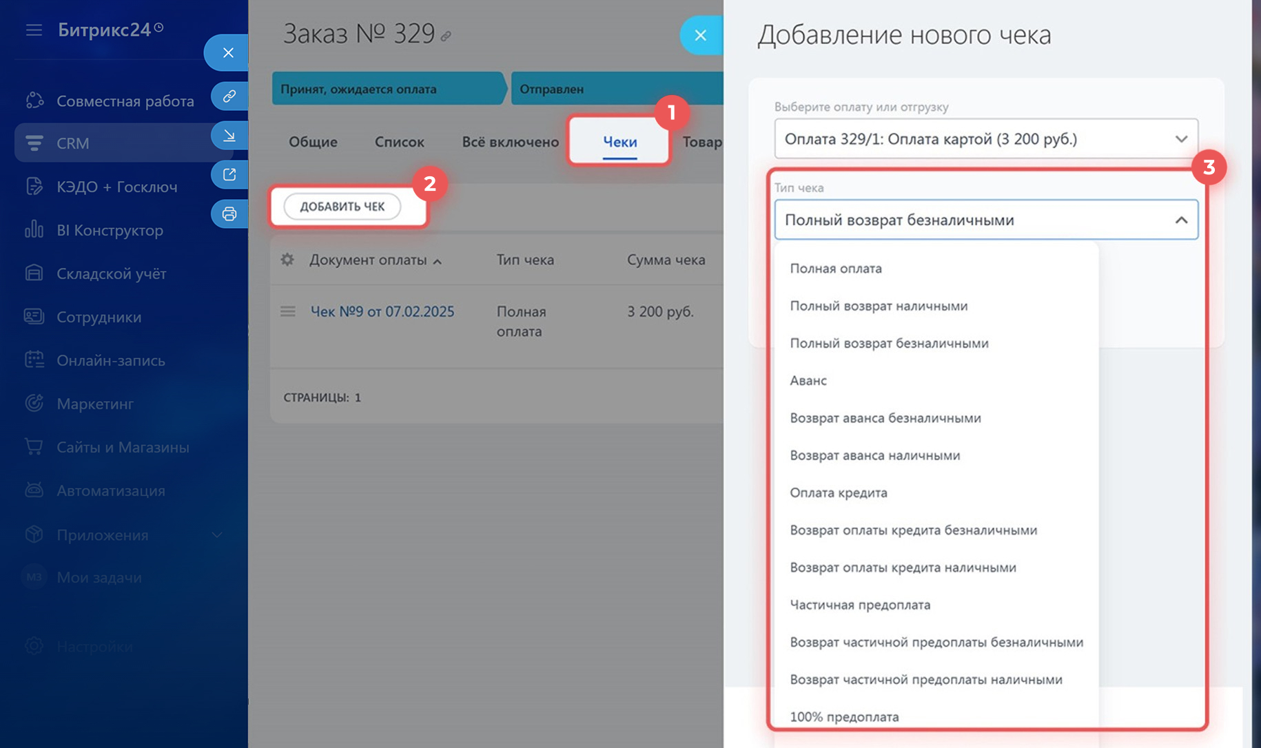 Напечатайте чек возврата. В заказе откройте вкладку Чеки, нажмите Добавить чек и напечатайте подходящий чек возврата.