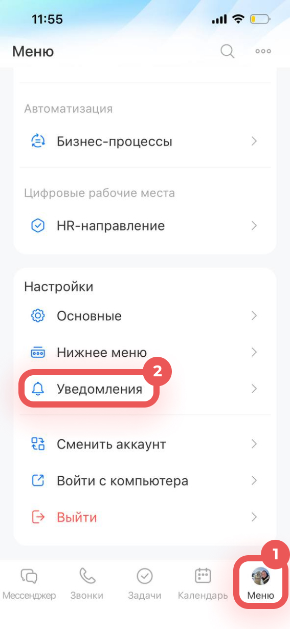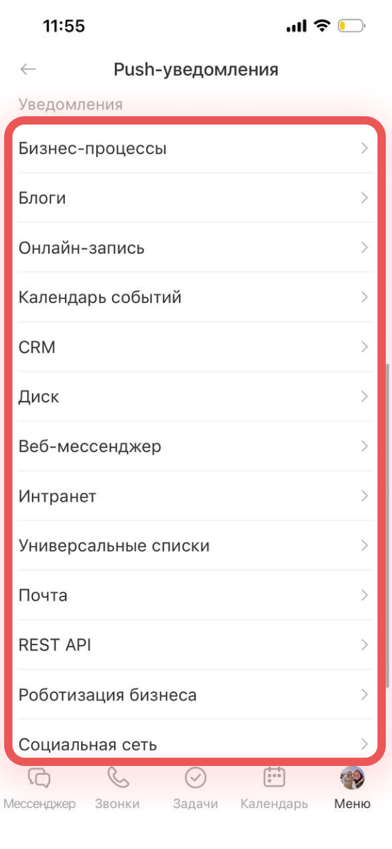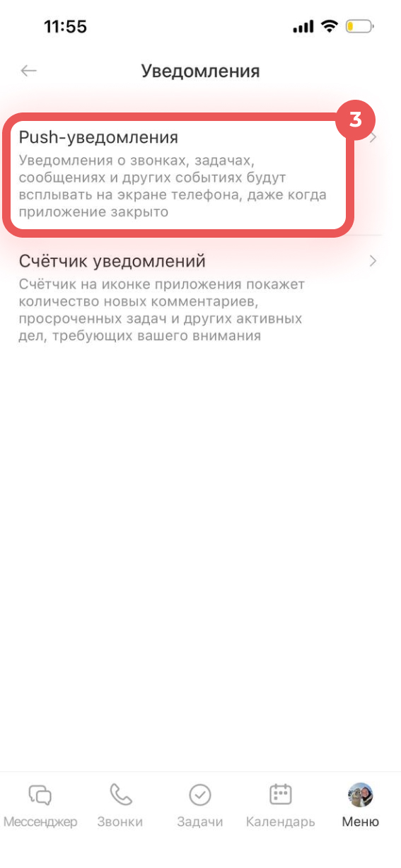 Push-уведомления сообщают о новых задачах, сообщениях, делах в CRM и других событиях — даже когда приложение закрыто. Чтобы уведомления приходили, нужно включить их в двух местах: в самом приложении и в настройках iPhone.