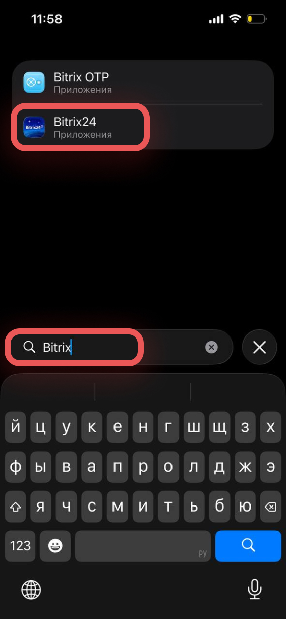 Откройте Настройки на iPhone и в строке поиска введите Bitrix24. Выберите приложение из списка.