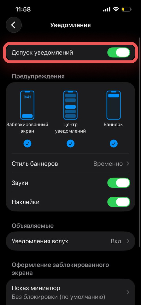 Убедитесь, что включен переключатель Допуск уведомлений. Здесь же выберите, как будут отображаться уведомления: на заблокированном экране, в центре уведомлений или в виде баннеров.