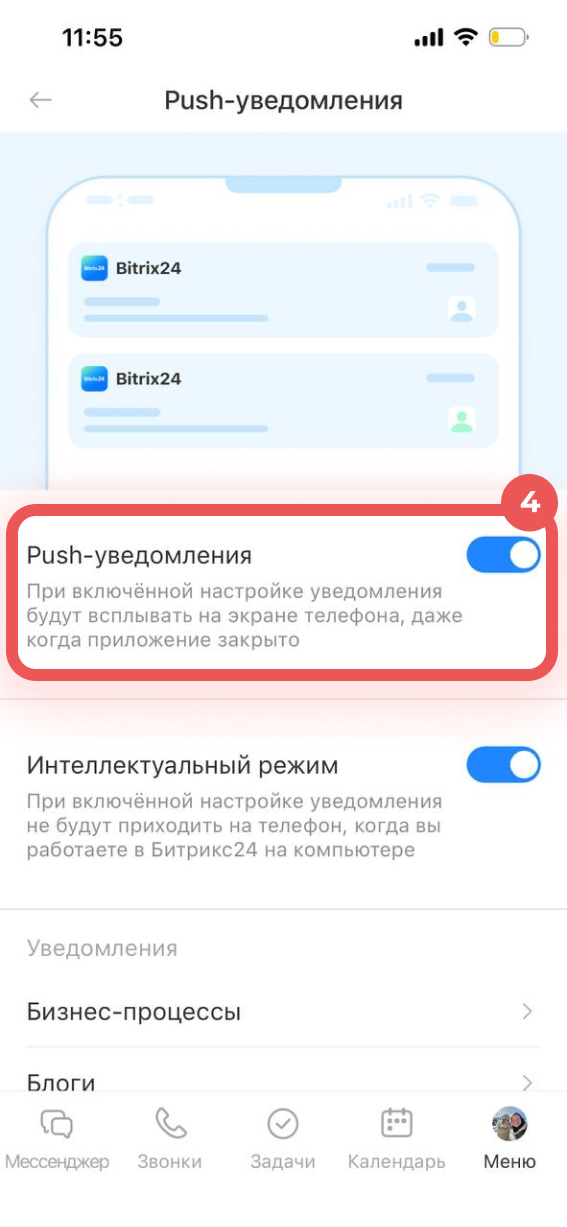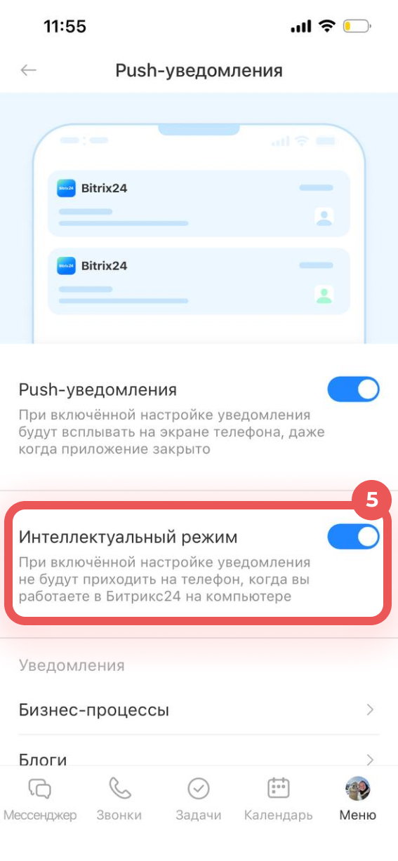 5. Если нужно, включите Интеллектуальный режим — уведомления не будут приходить на телефон, пока вы работаете в Битрикс24 на компьютере.