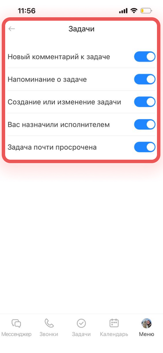 Например, в разделе Задачи можно отдельно включить уведомления о новых комментариях, напоминаниях, назначении исполнителем и приближении дедлайна.