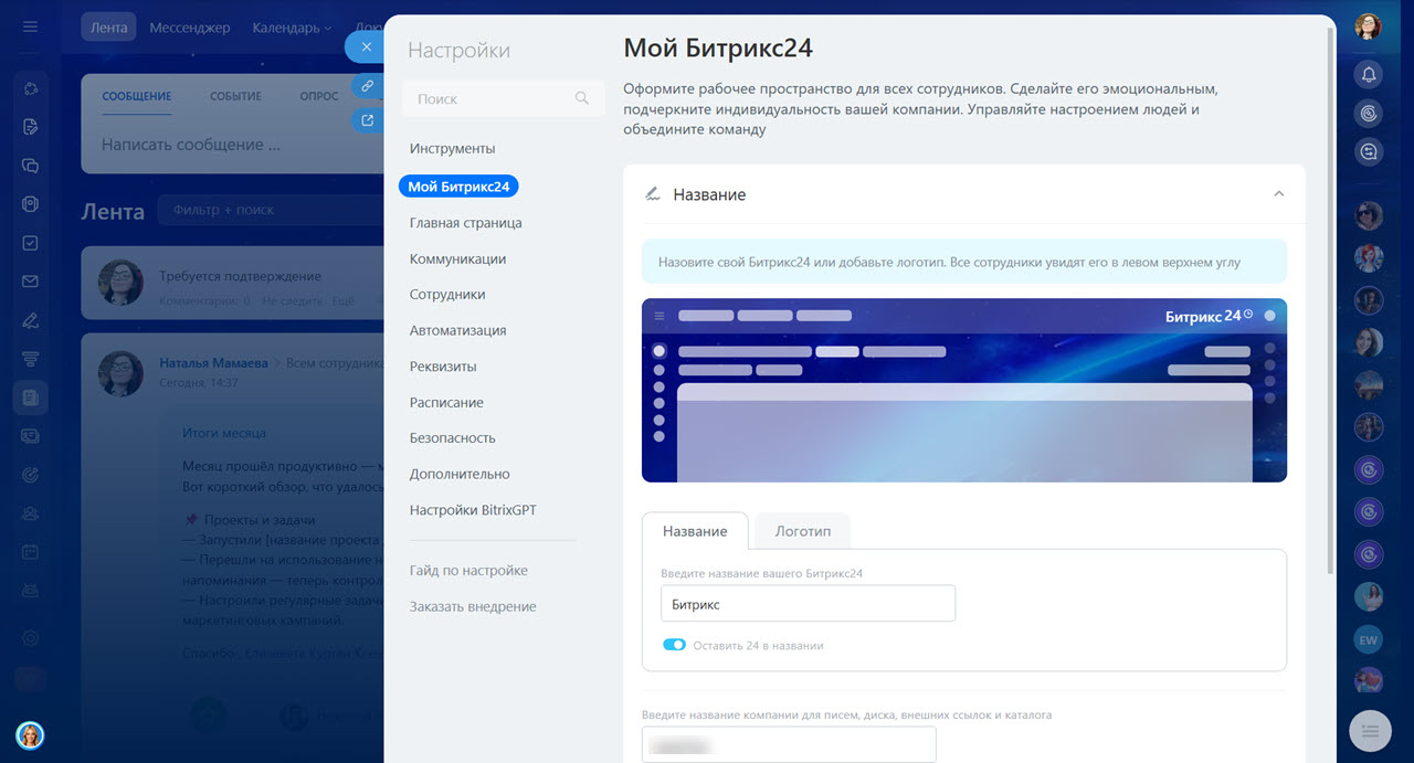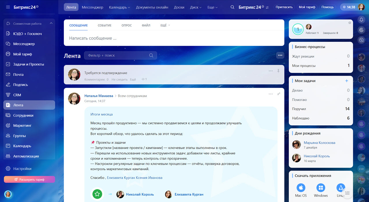 Битрикс24 — мультипространство для совместной работы, где задачи, чаты, звонки, календарь и другие инструменты связаны между собой. Вам не нужно переключаться между разными приложениями — в одном месте есть все, что нужно для работы.