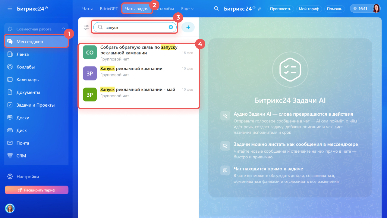 Перейдите в раздел Мессенджер > Чаты задач. Начните вводить название задачи в строку поиска над списком чатов — например, «запуск». Появится список результатов — выберите нужный чат задачи.
