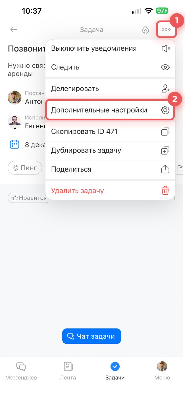 Чтобы задать правила выполнения и контроля задачи, откройте задачу и нажмите Три точки (…) > Дополнительные настройки. Здесь вы можете включить параметры: