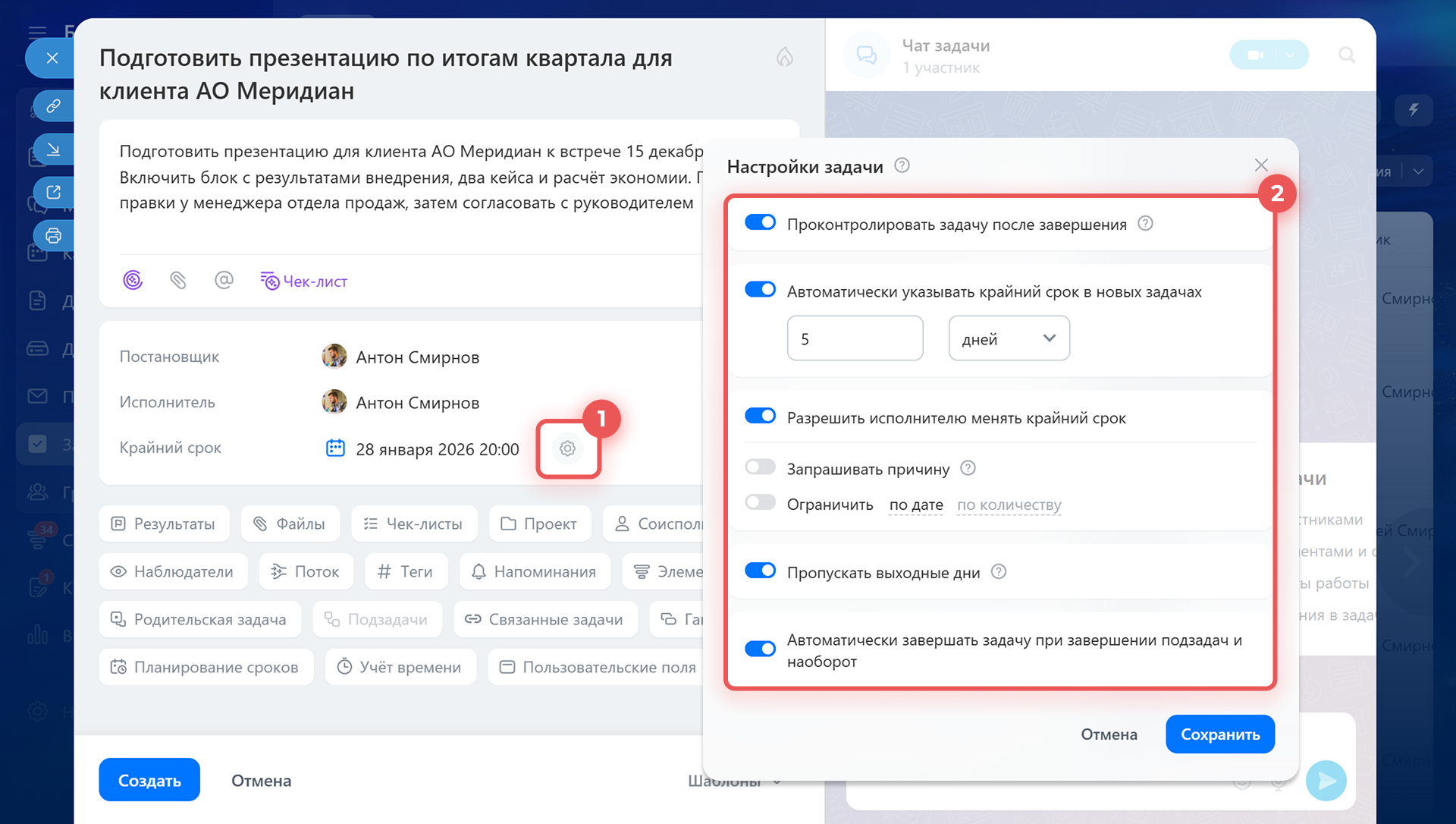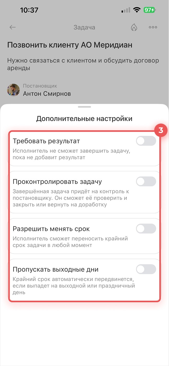 - Разрешить менять срок — исполнитель сможет переносить крайний срок без согласования. Используйте, если допускаете гибкие сроки.
